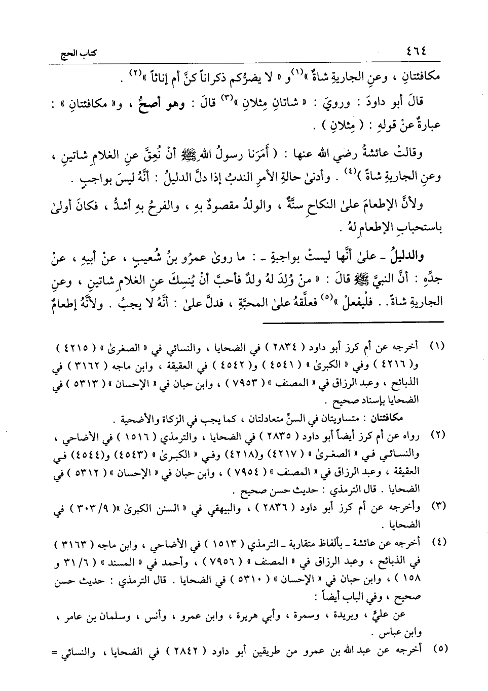 وقالت عائشة - رَضِيَ اللَّهُ عَنْهَا -: «أمرنا رسول الله - صَلَّى اللَّهُ عَلَيْهِ وَسَلَّمَ - أن نعق عن الغلام شاتين وعن الجارية شاة» . وأدنى حالة الأمر الندب إذا دل الدليل: أنه ليس بواجب.