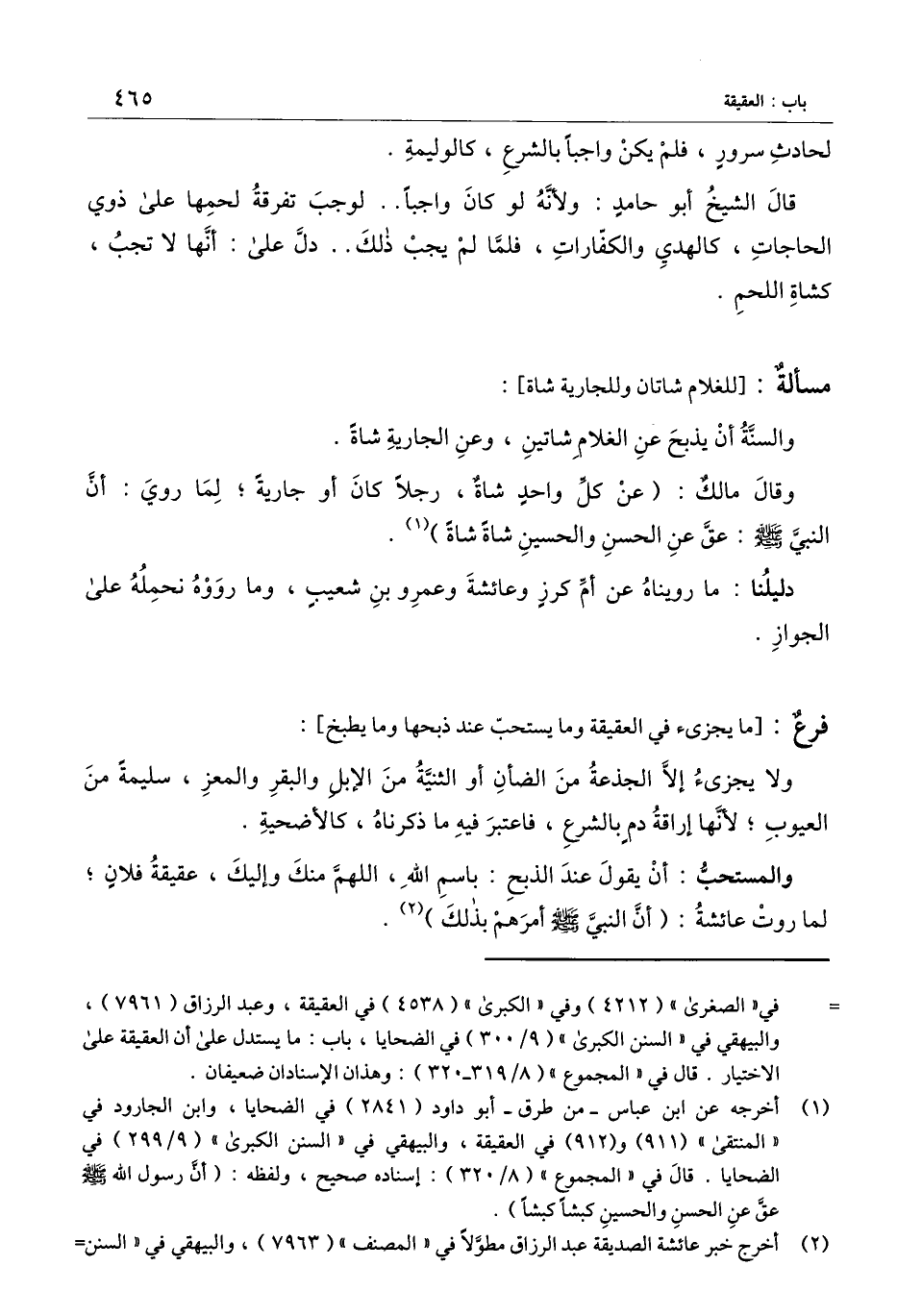والمستحب: أن يقول عند الذبح: باسم الله، اللهم منك وإليك، عقيقة فلان لما روت عائشة: (أن النبي - صَلَّى اللَّهُ عَلَيْهِ وَسَلَّمَ - أمرهم بذلك) .