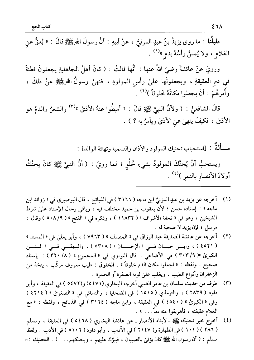 ] : ويستحب أن يحنك المولود بشيء حلو؛ لما روي: «أن النبي - صَلَّى اللَّهُ عَلَيْهِ وَسَلَّمَ - كان يحنك أولاد الأنصار بالتمر» .