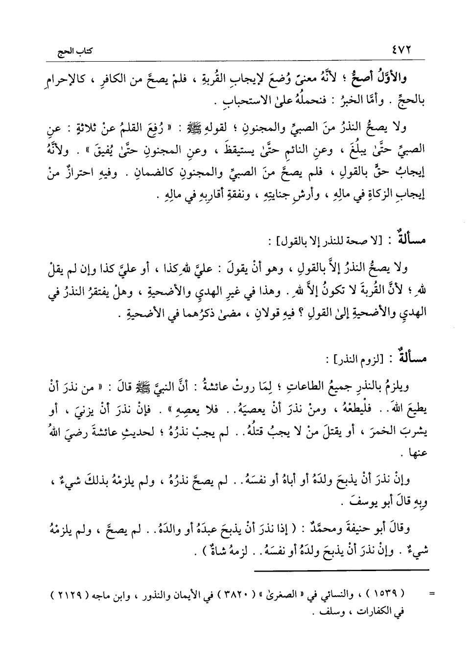 ولا يصح النذر من الصبي والمجنون؛ لقوله - صَلَّى اللَّهُ عَلَيْهِ وَسَلَّمَ -: «رفع القلم عن ثلاثة: عن الصبي حتى يبلغ، وعن النائم حتى يستيقظ، وعن المجنون حتى يفيق» ولأنه إيجاب حق بالقول، فلم يصح من الصبي والمجنون كالضمان. وفيه احتراز من إيجاب الزكاة في ماله، وأرش جنايته، ونفقة أقاربه في ماله.
