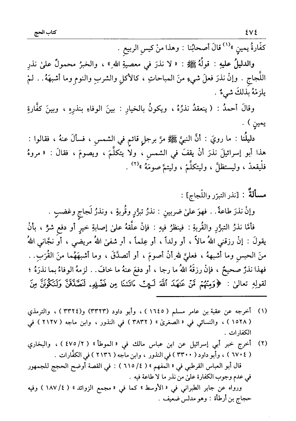والدليل عليه: قوله - صَلَّى اللَّهُ عَلَيْهِ وَسَلَّمَ -: «لا نذر في معصية الله» ، والخبر محمول على نذر اللجاج. وإن نذر فعل شيء من المباحات، كالأكل والشرب والنوم وما أشبهه لم يلزمه بذلك شيء.