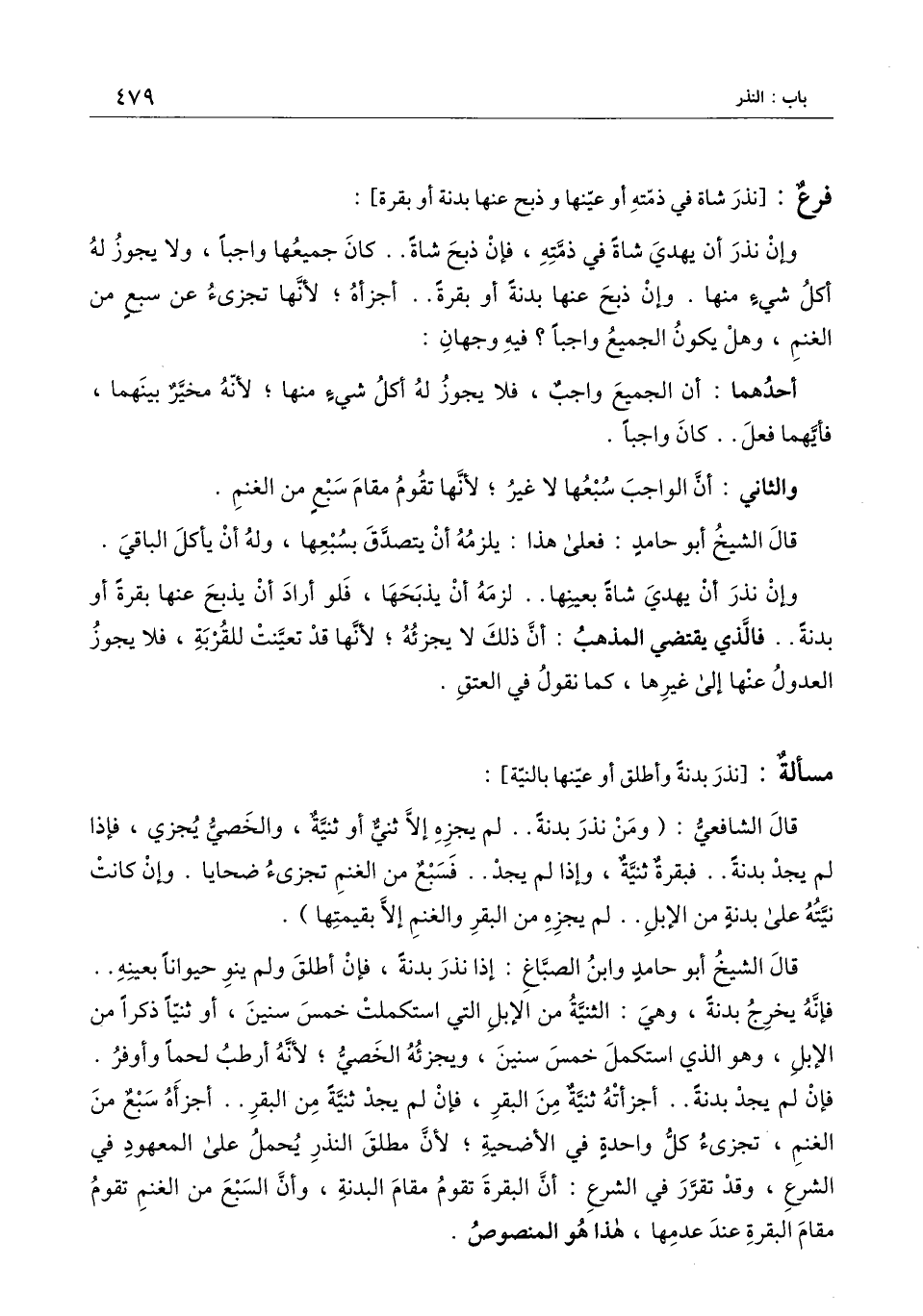 ] : وإن نذر أن يهدي شاة في ذمته، فإن ذبح شاة كان جميعها واجبا، ولا يجوز له أكل شيء منها، وإن ذبح عنها بدنة أو بقرة أجزأه؛ لأنها تجزئ عن سبع من الغنم، وهل يكون الجميع واجبا؟ فيه وجهان: