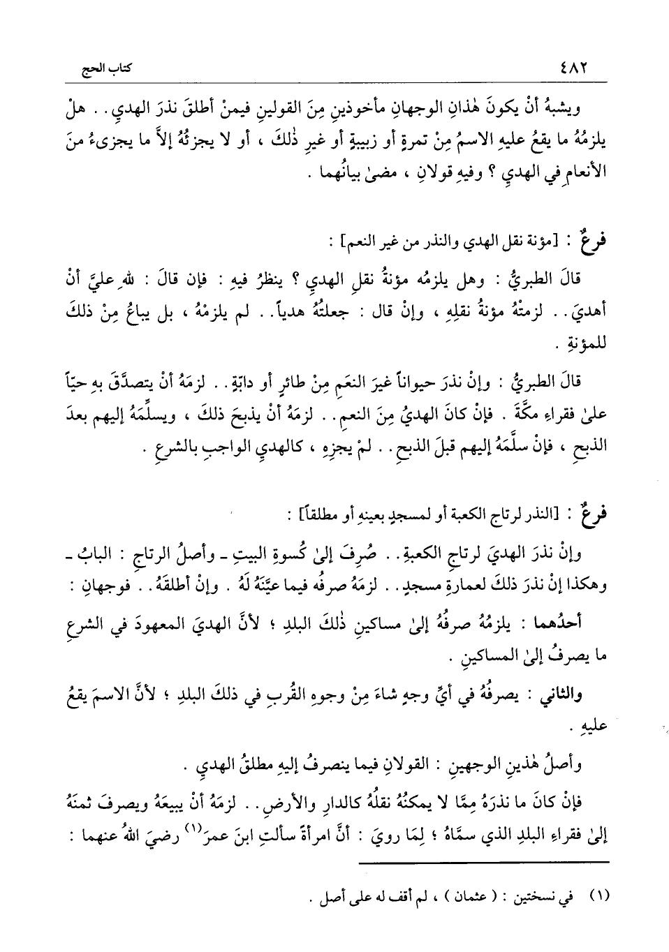 فرع: [النذر لرتاج الكعبة أو لمسجد بعينه أو مطلقا] : وإن نذر الهدي لرتاج الكعبة صرف إلى كسوة البيت - وأهل الرتاج: الباب - وهكذا إن نذر ذلك لعمارة مسجد لزمه صرفه فيما عينه له. وإن أطلقه فوجهان: