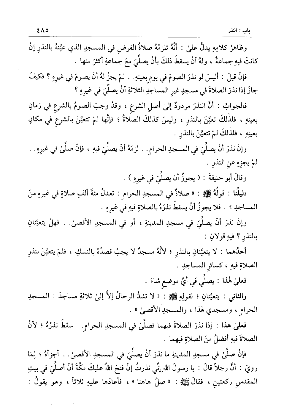 وإن نذر أن يصلي في مسجد المدينة، أو في المسجد الأقصى فهل يتعينان بالنذر؟ فيه قولان: