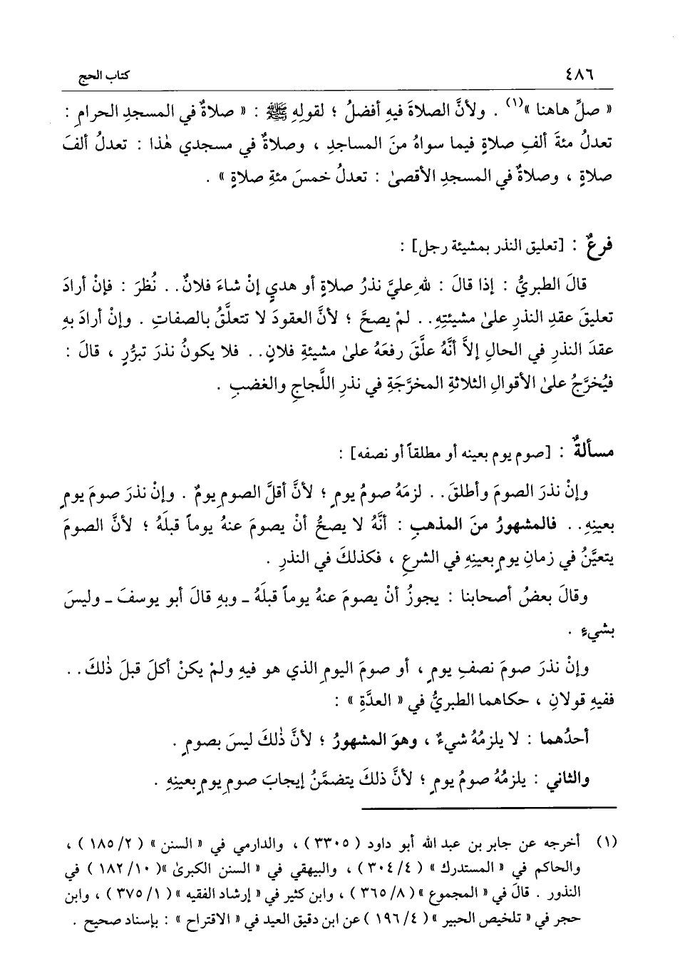 ] : قال الطبري: إذا قال: لله علي نذر صلاة أو هدي إن شاء فلان نظر: فإن أراد تعليق عقد النذر على مشيئته لم يصح؛ لأن العقود لا تتعلق بالصفات. وإن أراد به عقد النذر في الحال إلا أنه علق رفعه على مشيئة فلان فلا يكون نذر تبرر، قال: فيخرج على الأقوال الثلاثة المخرجة في نذر اللجاج والغضب.