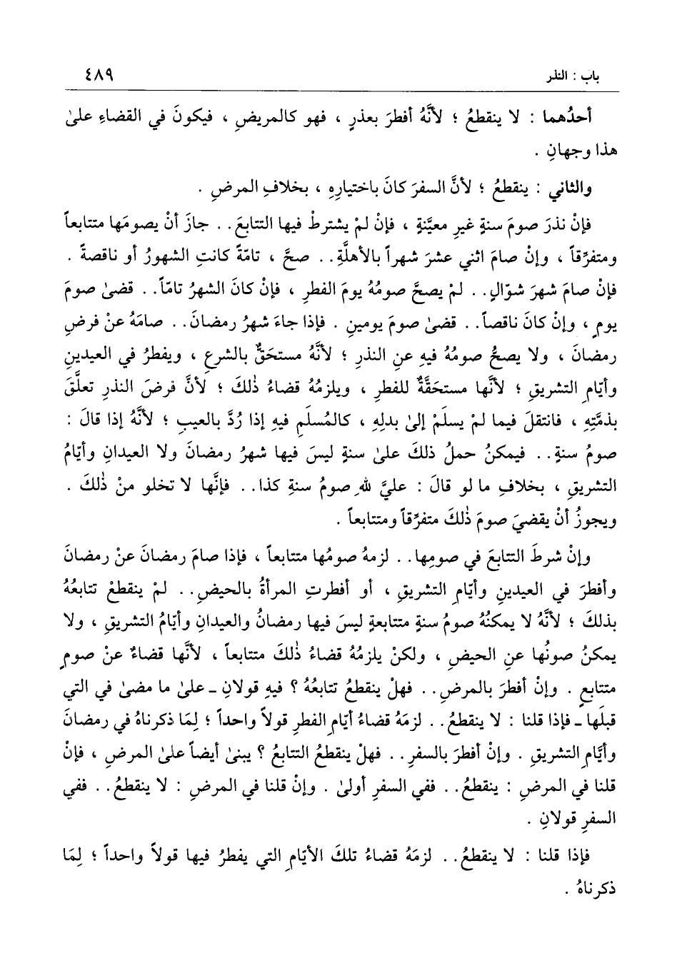 وإن شرط التتابع في صومها لزمه صومها متتابعا، فإذا صام رمضان عن رمضان وأفطر في العيدين وأيام التشريق، أو أفطرت المرأة بالحيض لم ينقطع تتابعه بذلك؛ لأنه لا يمكنه صوم سنة متتابعة ليس فيها رمضان والعيدان وأيام التشريق، ولا يمكن صونها عن الحيض، ولكن يلزمه قضاء ذلك متتابعا، لأنها قضاء عن صوم متتابع. وإن أفطر بالمرض فهل ينقطع تتابعه؟ فيه قولان - على ما مضى في التي قبلها - فإذا قلنا: لا ينقطع لزمه قضاء أيام الفطر قولا واحدا؛ لما ذكرناه في رمضان وأيام التشريق. وإن أفطر بالسفر فهل ينقطع التتابع؟ يبنى أيضًا على المرض، فإن قلنا في المرض: ينقطع ففي السفر أولى. وإن قلنا في المرض: لا ينقطع ففي السفر قولان: