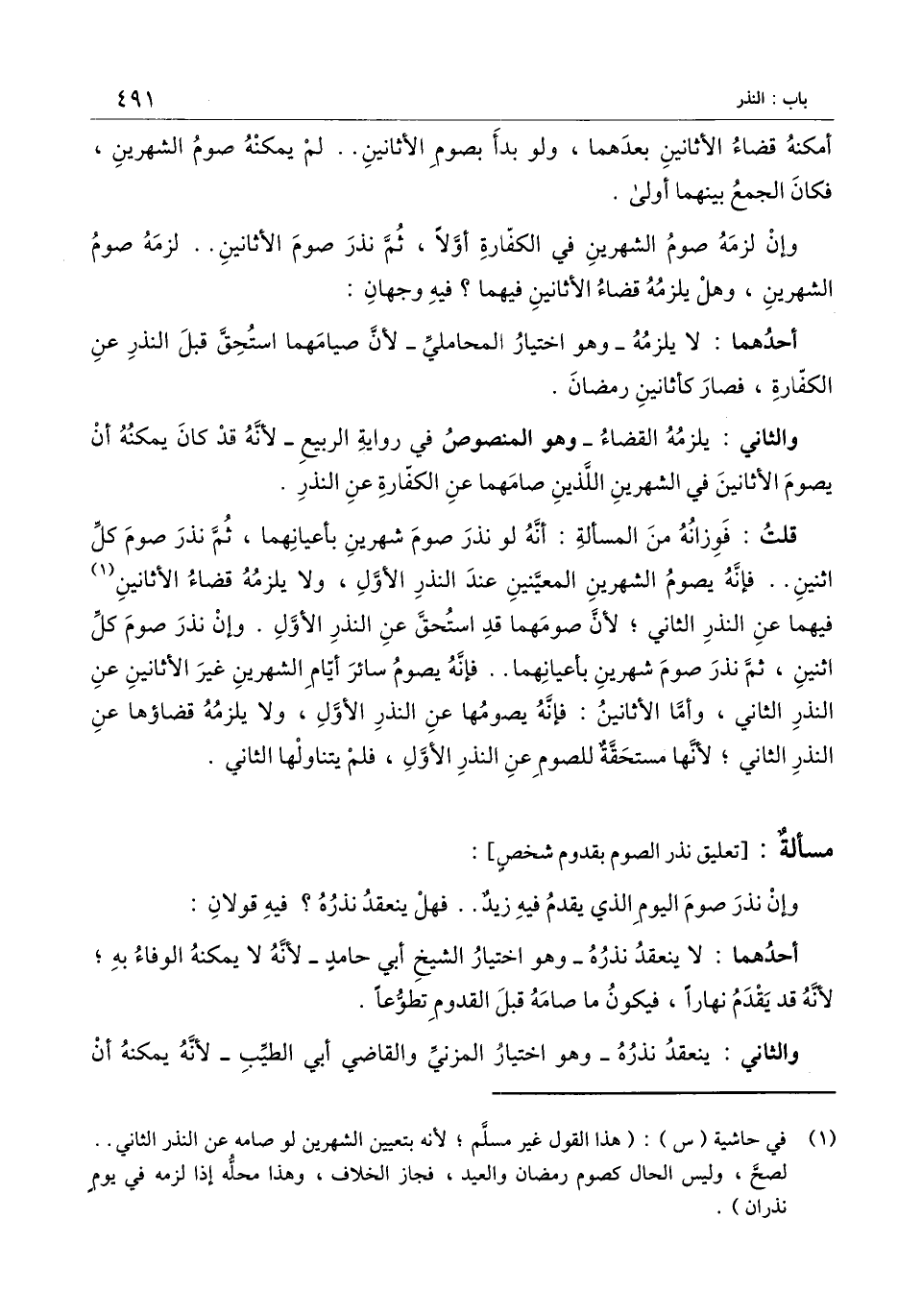 قلت: فوزانه من المسألة: أنه لو نذر صوم شهرين بأعيانهما، ثم نذر صوم كل اثنين فإنه يصوم الشهرين المعينين عند النذر الأول، ولا يلزمه قضاء الأثانين فيهما عن النذر الثاني؛ لأن صومهما قد استحق عن النذر الأول. وإن نذر صوم كل اثنين، ثم نذر صوم شهرين بأعيانهما فإنه يصوم سائر أيام الشهرين غير الأثانين عن النذر الثاني، وأما الأثانين: فإنه يصومها عن النذر الأول، ولا يلزمه قضاؤها عن النذر الثاني؛ لأنها مستحقة للصوم عن النذر الأول، فلم يتناولها الثاني.