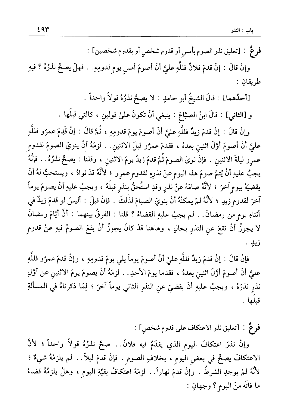 وإن قال: إن قدم زيد فلله علي أن أصوم يوم قدومه، ثم قال: إن قدم عمرو فلله علي أن أصوم أول اثنين بعده، فقدم عمرو قبل الاثنين لزمه أن ينوي الصوم لقدوم عمرو ليلة الاثنين. فإن نوى الصوم ثم قدم زيد يوم الاثنين، وقلنا: يصح نذره فإنه يجب عليه أن يتم صوم هذا اليوم عن نذره لقدوم عمرو؛ لأنه قد نواه، ويستحب له أن يقضيه بيوم آخر؛ لأنه صامه عن نذر وقد استحق بنذر قبله، ويجب عليه أن يصوم يوما آخر لقدوم زيد؛ لأنه لم يمكنه أن ينوي الصيام لذلك. فإن قيل: أليس لو قدم زيد في أثناء يوم من رمضان لم يجب عليه القضاء؟ قلنا: الفرق بينهما: أن أيام رمضان لا يجوز أن تقع عن النذر بحال، وهاهنا قد كان يجوز أن يقع الصوم فيه عن قدوم زيد.