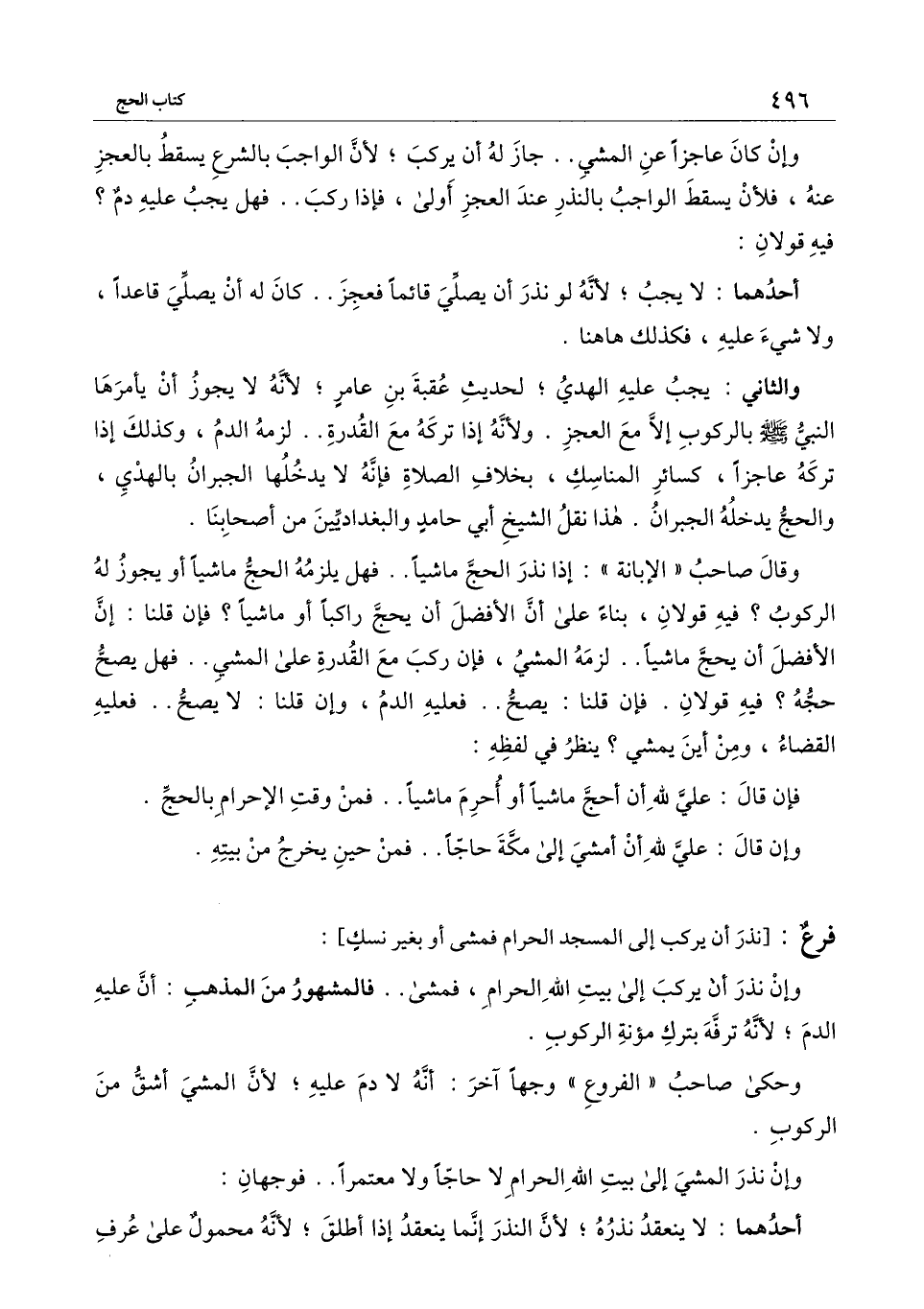 ] : وإن نذر أن يركب إلى بيت الله الحرام فمشى فالمشهور من المذهب: أن عليه الدم: لأنه ترفه بترك مؤنة الركوب. وحكى صاحب " الفروع " وجها آخر: أنه لا دم عليه؛ لأن المشي أشق من الركوب.