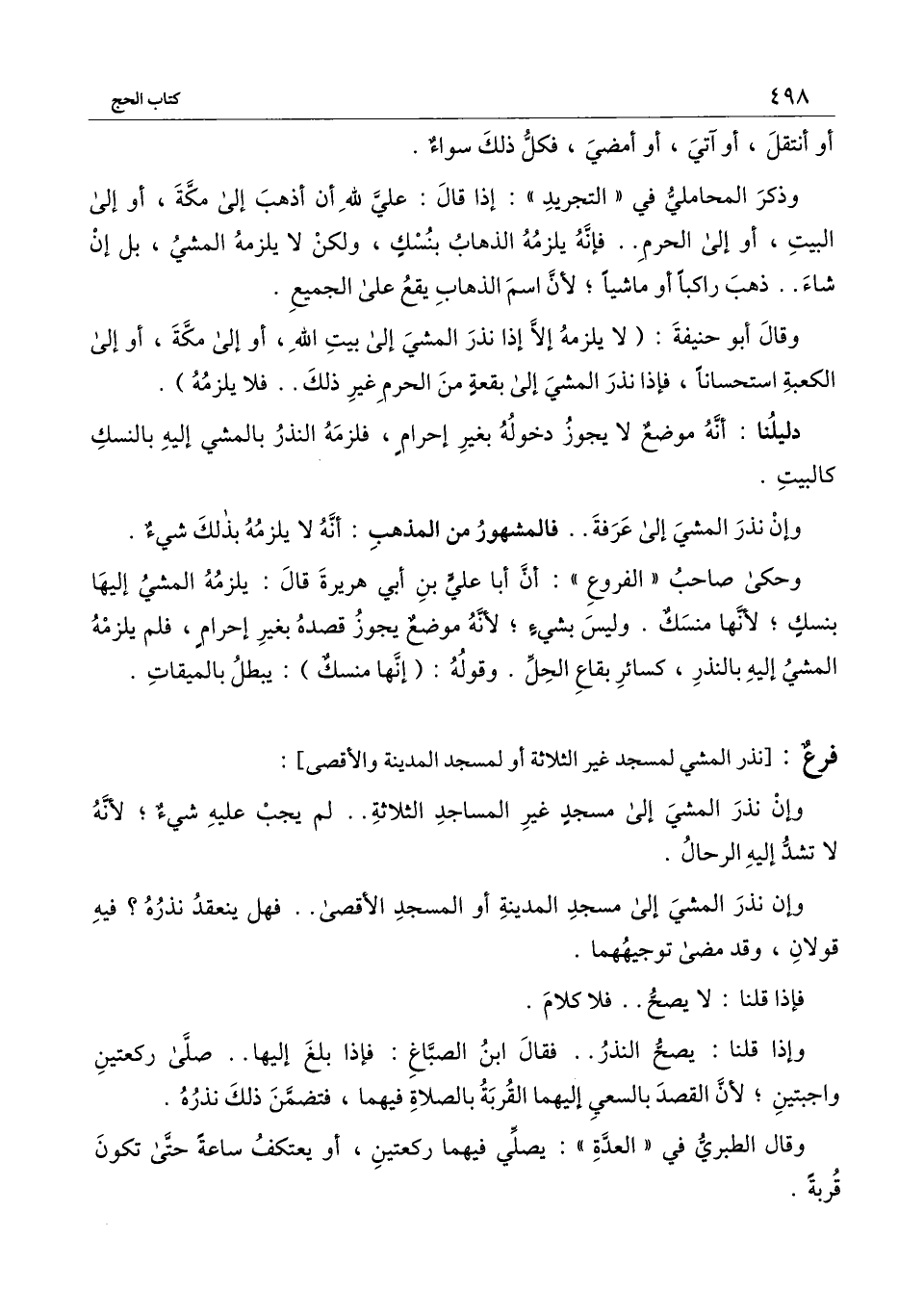 وحكى صاحب " الفروع ": أن أبا علي بن أبي هريرة قال: يلزمه المشي إليها بنسك؛ لأنها منسك. وليس بشيء؛ لأنه موضع يجوز قصده بغير إحرام، فلم يلزمه المشي إليه بالنذر، كسائر بقاع الحل. وقوله: (إنها منسك) : يبطل بالميقات.
