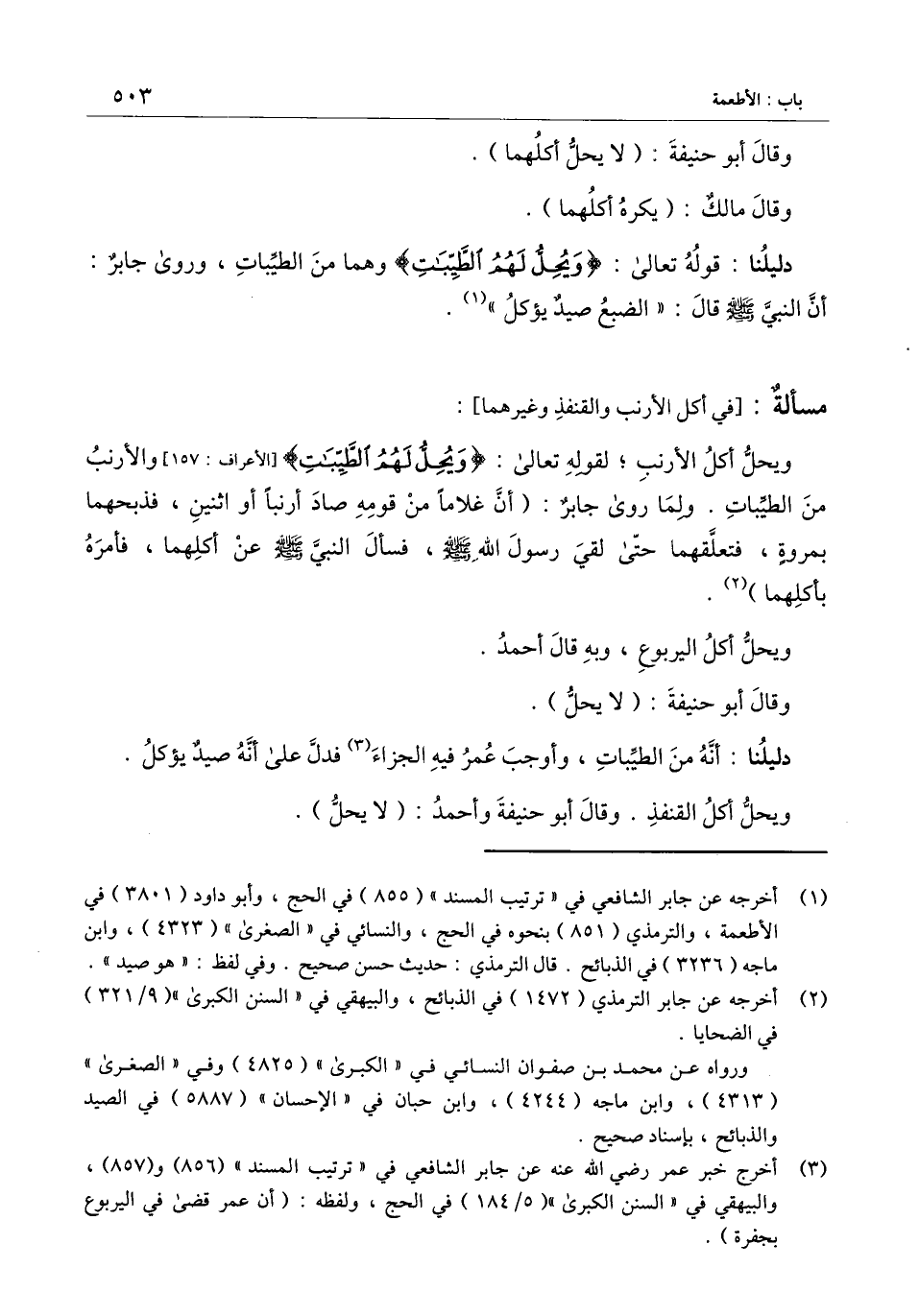 ] : ويحل أكل الأرنب؛ لِقَوْلِهِ تَعَالَى: {وَيُحِلُّ لَهُمُ الطَّيِّبَاتِ} [الأعراف: 157] [الأعراف: 157] والأرنب من الطيبات. ولما روى جابر: «أن غلاما من قومه صاد أرنبا أو اثنين، فذبحهما بمروة، فتعلقهما حتى لقي رسول الله - صَلَّى اللَّهُ عَلَيْهِ وَسَلَّمَ -، فسأل النبي - صَلَّى اللَّهُ عَلَيْهِ وَسَلَّمَ - عن أكلهما، فأمره بأكلهما» .