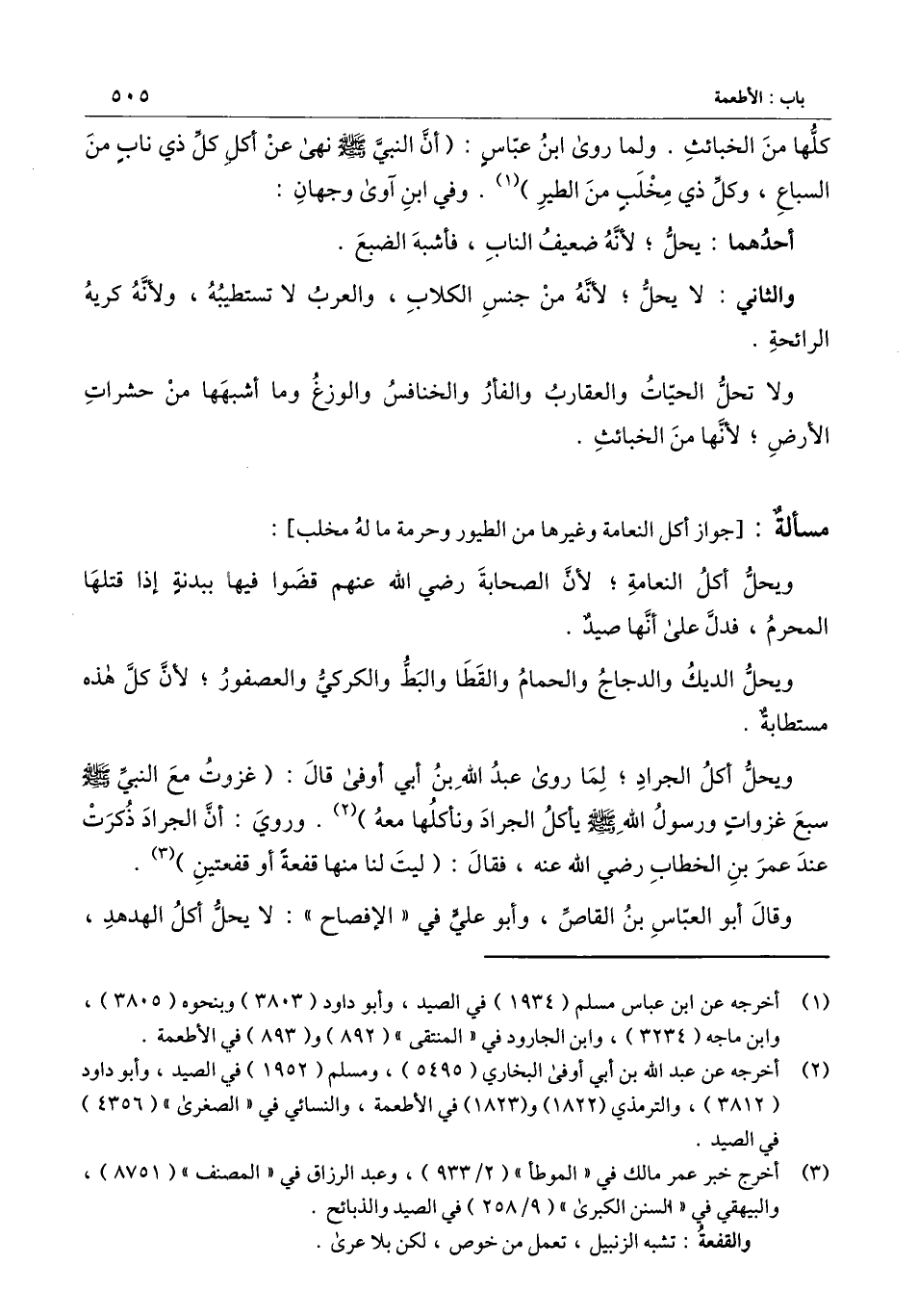 ويحل أكل الجراد؛ لما «روى عبد الله بن أبي أوفى قال: (غزوت مع النبي - صَلَّى اللَّهُ عَلَيْهِ وَسَلَّمَ - سبع غزوات ورسول الله - صَلَّى اللَّهُ عَلَيْهِ وَسَلَّمَ - يأكل الجراد ونأكلها معه» . وروي: أن الجراد ذكرت عند عمر بن الخطاب - رَضِيَ اللَّهُ عَنْهُ -، فقال: (ليت لنا منها قفعة أو قفعتين) .