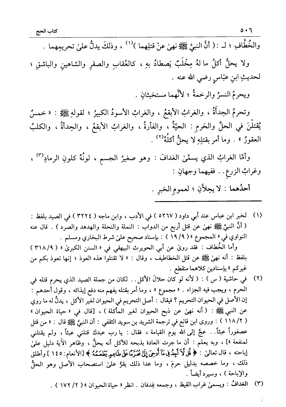 وتحرم الحدأة، والغراب الأبقع، والغراب الأسود الكبير؛ لقوله - صَلَّى اللَّهُ عَلَيْهِ وَسَلَّمَ -: «خمس يقتلن في الحل والحرم: الحية، والفأرة، والغراب الأبقع، والحدأة، والكلب العقور» وما أمر بقتله لا يحل أكله.