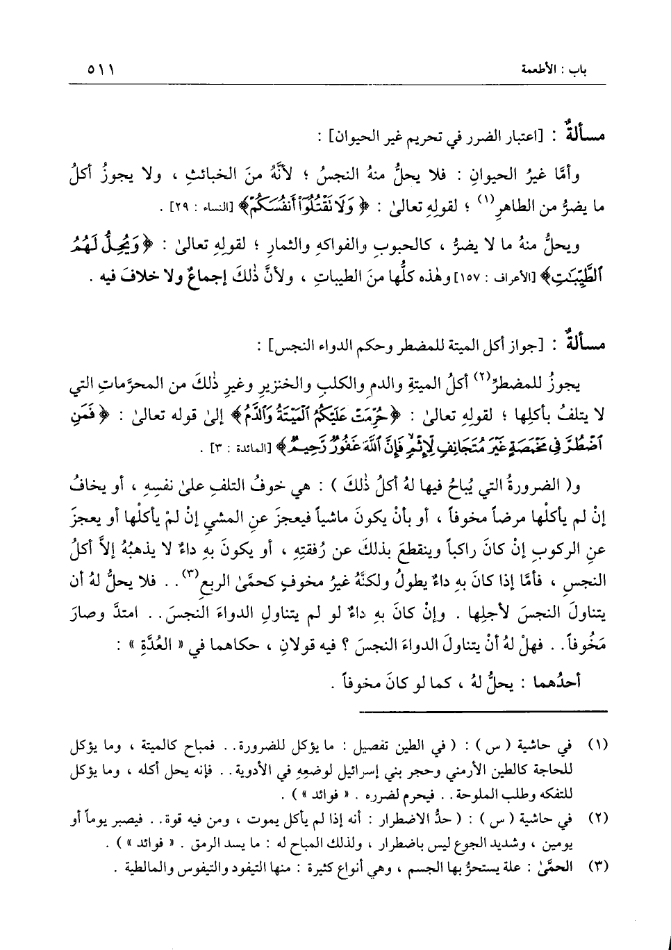 و (الضرورة التي يباح فيها له أكل ذلك) : هي خوف التلف على نفسه، أو يخاف إن لم يأكلها مرضا مخوفا، أو أن يكون ماشيا فيعجز عن المشي إن لم يأكلها أو يعجز عن الركوب إن كان راكبا وينقطع بذلك عن رفقته، أو يكون به داء لا يذهبه إلا أكل النجس، فأما إذا كان به داء يطول ولكنه غير مخوف كحمى الربع فلا يحل له أن يتناول النجس لأجلها، وإن كان به داء لو لم يتناول الدواء النجس امتد وصار مخوفا فهل له أن يتناول الدواء النجس؟ فيه قولان، حكاهما في " العدة ":