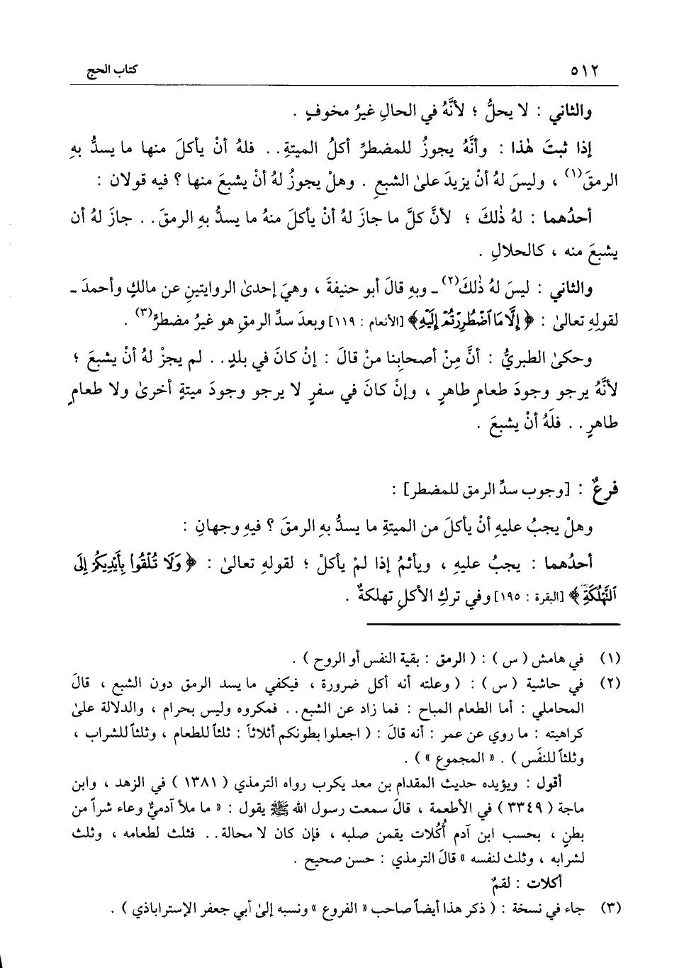 إذا ثبت هذا: وأنه يجوز للمضطر أكل الميتة فله أن يأكل منها ما يسد به الرمق، وليس له أن يزيد على الشبع. وهل يجوز له أن يشبع منها؟ فيه قولان: