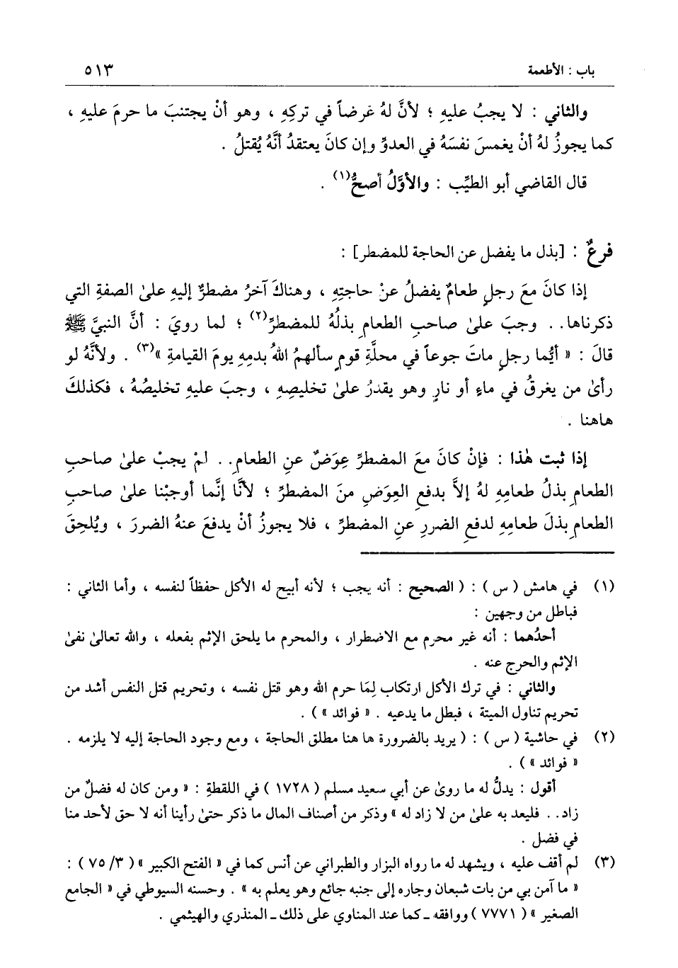 ] : إذا كان مع رجل طعام يفضل عن حاجته، وهناك آخر مضطر إليه على الصفة التي ذكرناها.. وجب على صاحب الطعام بذله للمضطر؛ لما روي: أن النبي ـ - صَلَّى اللَّهُ عَلَيْهِ وَسَلَّمَ - ـ قال: «أيما رجل مات جوعا في محلة قوم سألهم الله بدمه يوم القيامة» . ولأنه لو رأى من يغرق في ماء أو نار وهو يقدر على تخليصه، وجب عليه تخليصه، فكذلك هاهنا.