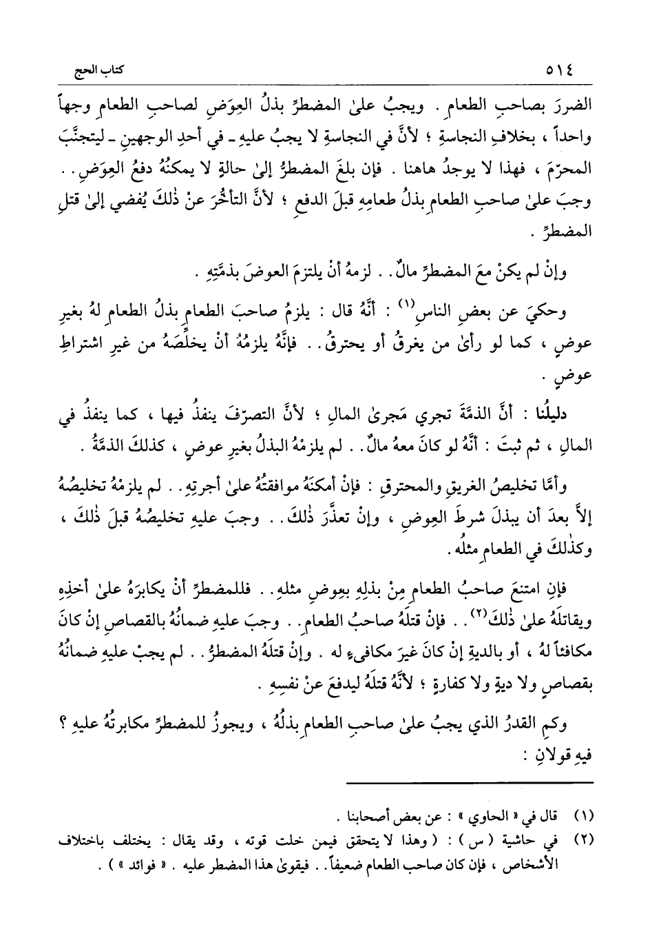 الضرر بصاحب الطعام. ويجب على المضطر بذل العوض لصاحب الطعام وجها واحدا، بخلاف النجاسة؛ لأن في النجاسة لا يجب عليه ـ في أحد الوجهين ـ ليتجنب المحرم، فهذا لا يوجد هاهنا. فإن بلغ المضطر إلى حالة لا يمكنه دفع العوض ... وجب على صاحب الطعام بذل طعامه قبل الدفع؛ لأن التأخر عن ذلك يفضي إلى قتل المضطر.