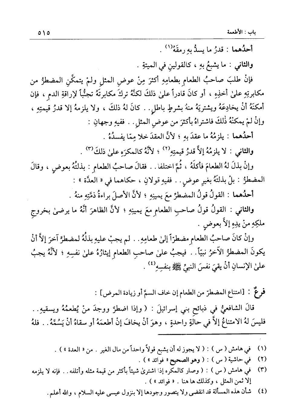 وإن كان صاحب الطعام مضطرا إلى طعامه.. لم يجب عليه بذله لمضطر آخر إلا أن يكون المضطر الآخر نبيا.. فيجب على صاحب الطعام إيثاره على نفسه؛ لأنه يجب على الإنسان أن يقي نفس النبي ـ - صَلَّى اللَّهُ عَلَيْهِ وَسَلَّمَ - ـ بنفسه.