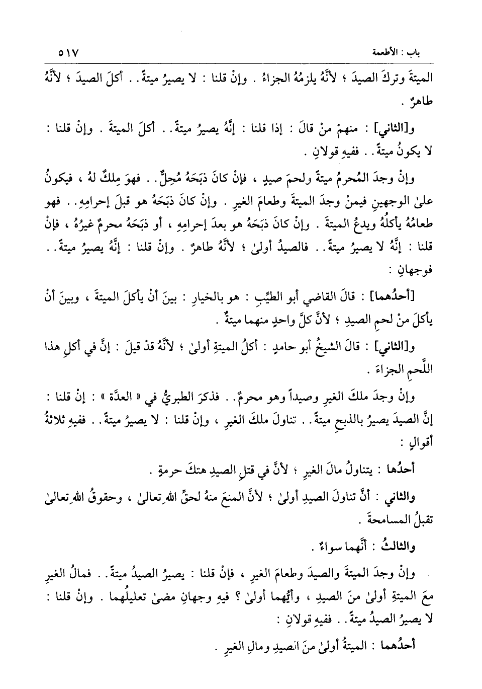 وإن وجد المحرم ميتة ولحم صيد، فإن كان ذبحه محل ... فهو ملك له، فيكون على الوجهين فيمن وجد الميتة وطعام الغير وإن كان ذبحه هو قبل إحرامه، فهو طعامه يأكله ويدع الميتة. وإن كان ذبحه هو بعد إحرامه أو ذبحه محرم غيره، فإن قلنا: إنه لا يصير ميتة