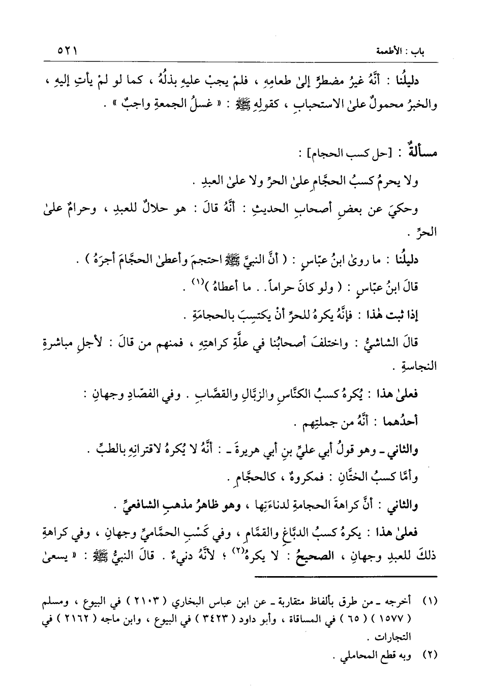 ولا يحرم كسب الحجام على الحر ولا على العبد.