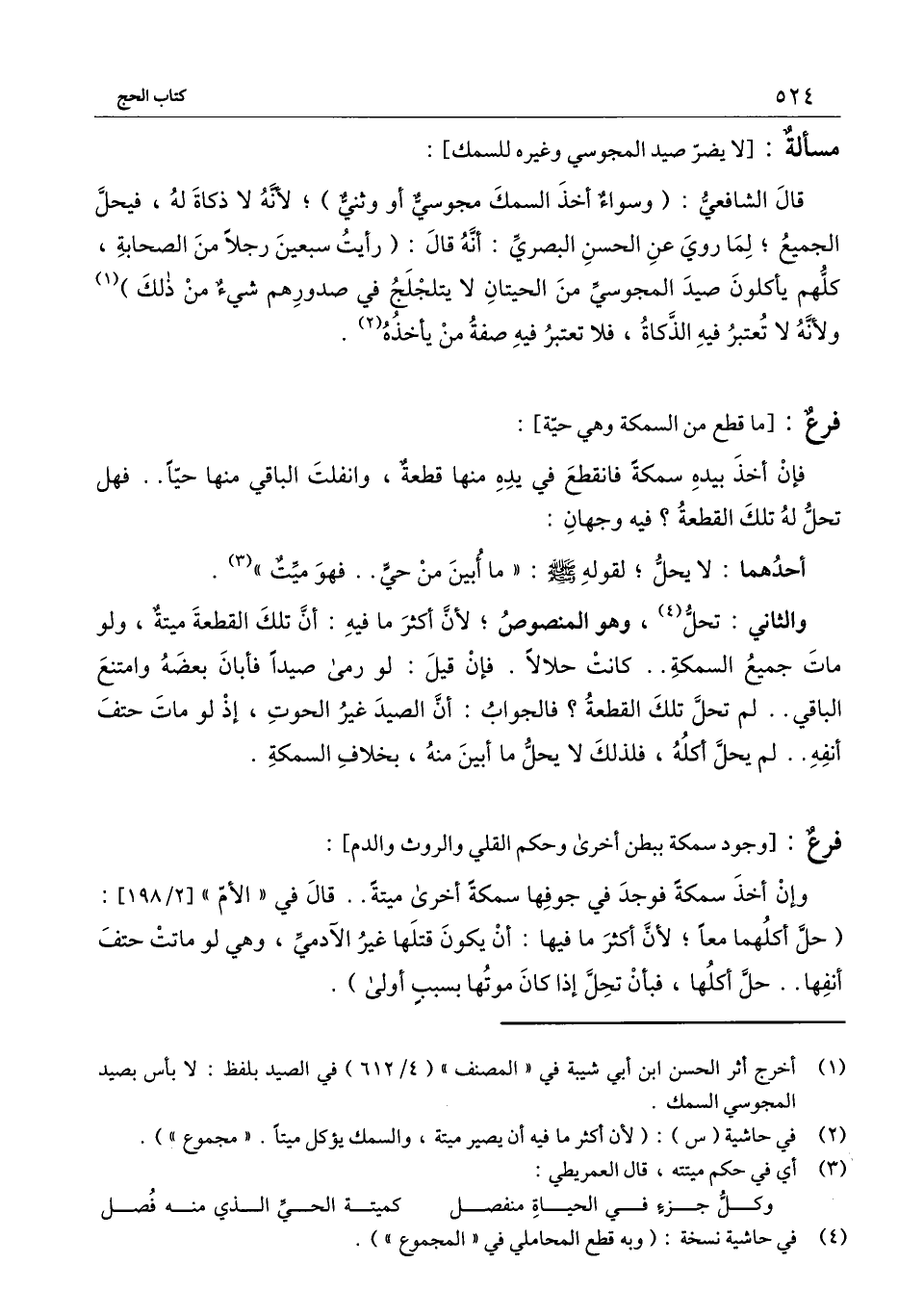 ] : وإن أخذ سمكة فوجد في جوفها سمكة أخرى ميتة.. قال في " الأم " 2/198] : (حل أكلهما معا؛ لأن أكثر ما فيها: أن يكون قتلها غير الآدمي، وهي لو ماتت حتف أنفها.. حل أكلها، فبأن تحل إذا كان موتها بسبب أولى) .