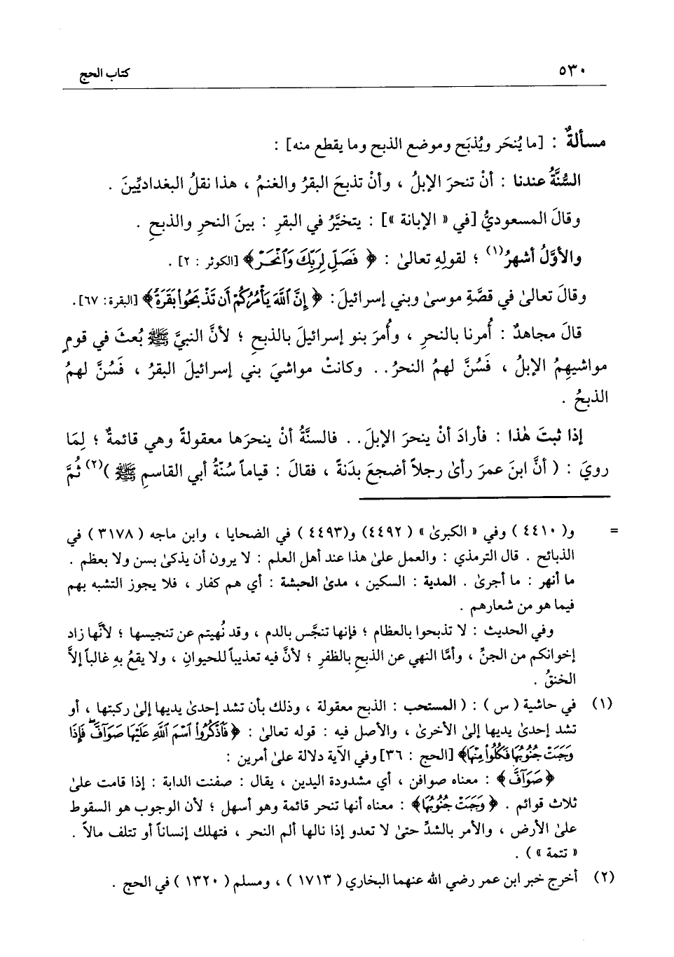 ] : السنة عندنا: أن تنحر الإبل، وأن تذبح البقر والغنم، هذا نقل البغداديين.