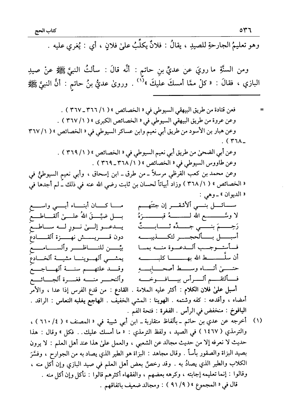 ومن السنة ما روي «عن عدي بن حاتم: أنه قال: سألت النبي ـ - صَلَّى اللَّهُ عَلَيْهِ وَسَلَّمَ - ـ عن صيد البازي، فقال: " كل مما أمسك عليك» . وروى عدي بن حاتم: أن النبي ـ - صَلَّى اللَّهُ عَلَيْهِ وَسَلَّمَ - ـ