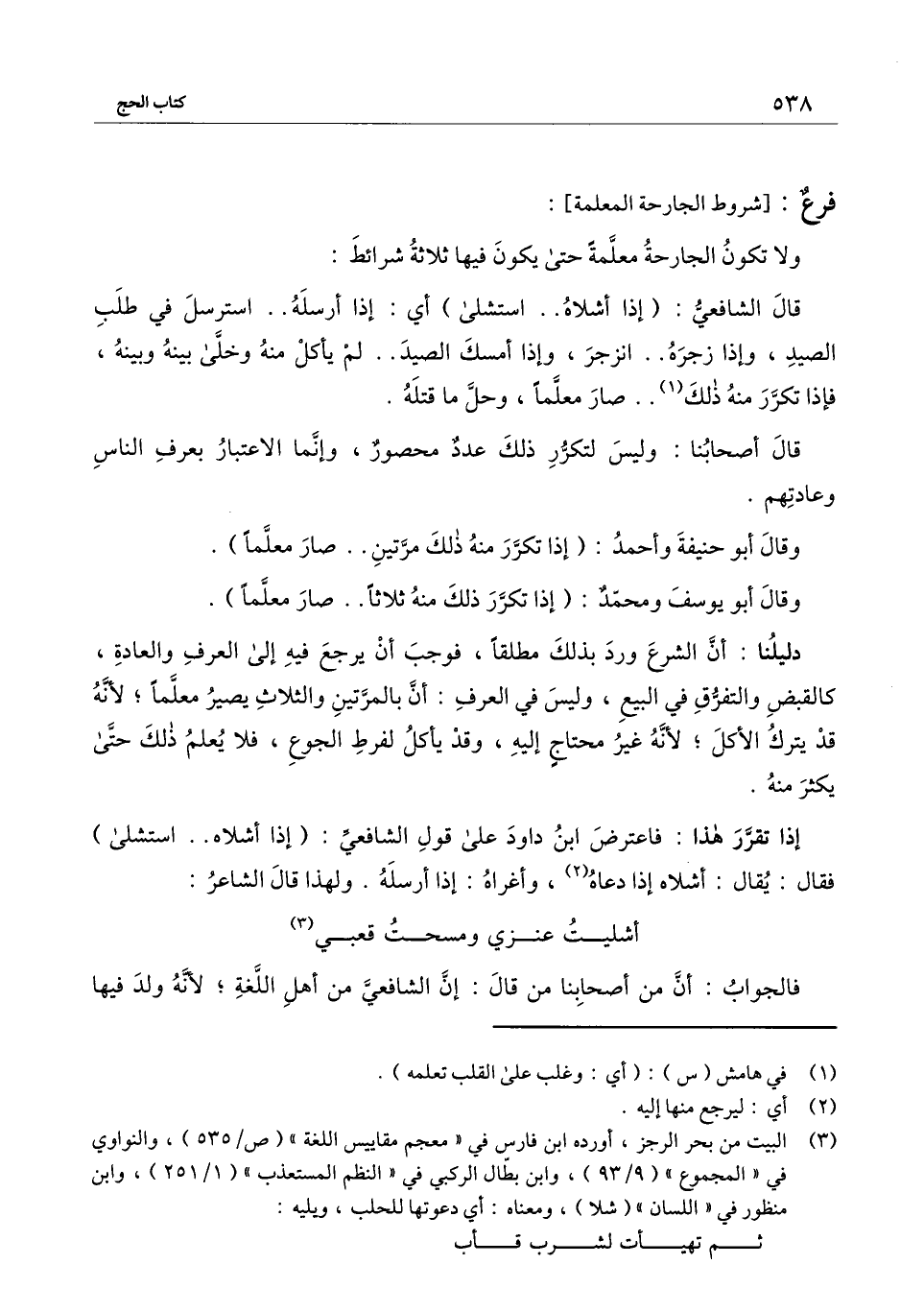 إذا تقرر هذا: فاعترض ابن داود على قول الشافعي: (إذا أشلاه.. استشلى) فقال: يقال: أشلاه إذا دعاه، وأغراه: إذا أرسله. ولهذا قال الشاعر: