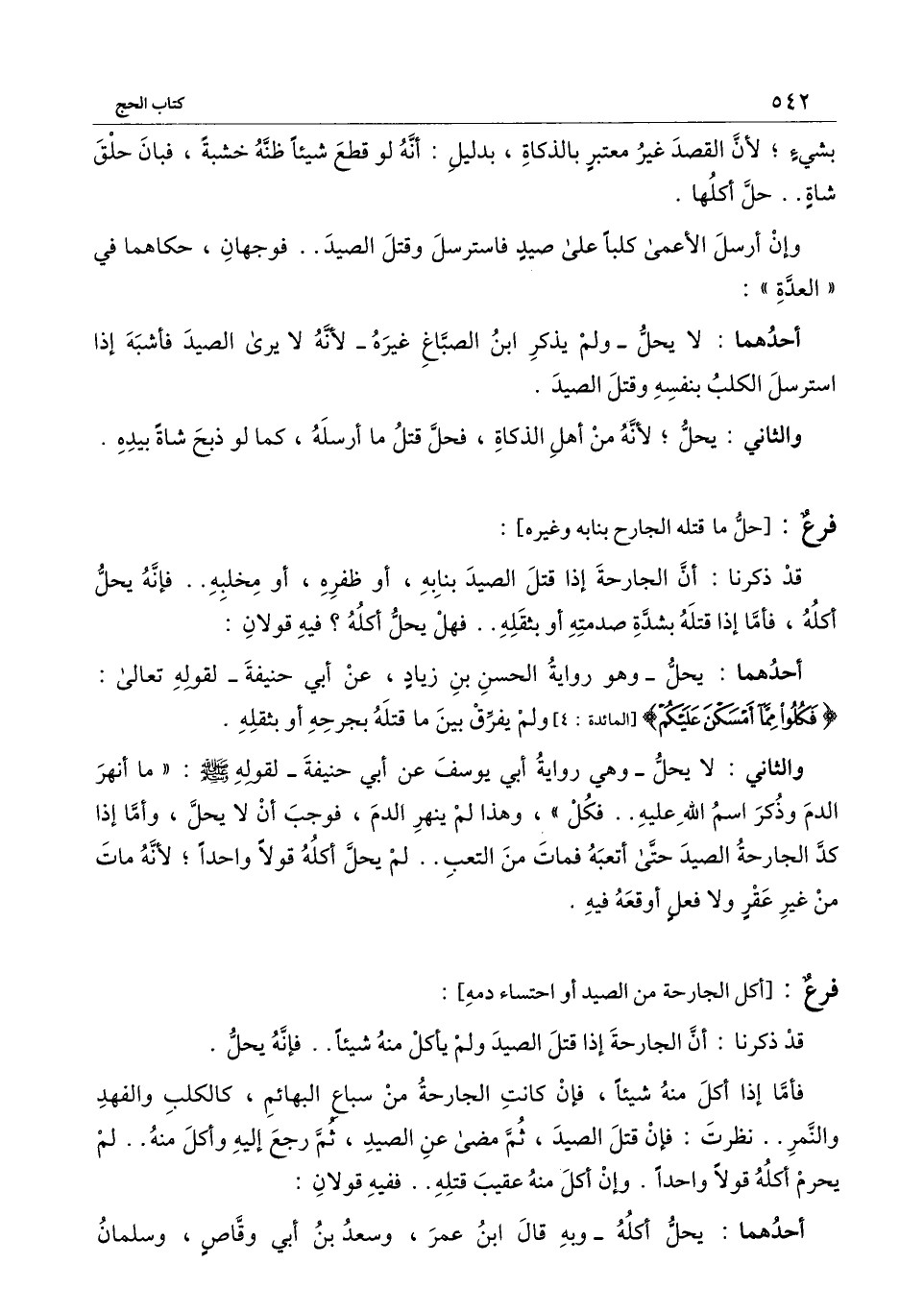 والثاني: لا يحل ـ وهي رواية أبي يوسف عن أبي حنيفة ـ لقوله ـ - صَلَّى اللَّهُ عَلَيْهِ وَسَلَّمَ - ـ «ما أنهر الدم وذكر اسم الله عليه.. فكل» وهذا لم ينهر الدم، فوجب أن لا يحل، وأما إذا كد الجارحة الصيد حتى أتعبه فمات من التعب.. لم يحل أكله قولا واحدا؛ لأنه مات من غير عقر ولا فعل أوقعه فيه.