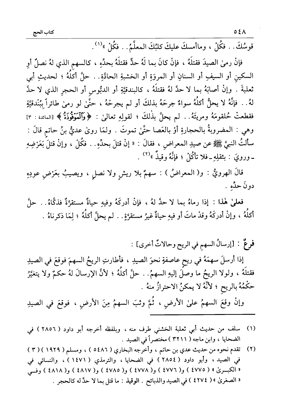 فإن رمى الصيد فقتله، فإن كان بما له حد فقتله بحده، كالسهم الذي له نصل أو السكين أو السيف أو السنان أو المروة أو الخشبة الحادة: حل أكله لحديث أبي ثعلبة. وإن أصابه بما لا حد له فقتله كالبندقية أو الدبوس أو الحجر الذي لا حد له.. فإنه لا يحل أكله سواء جرحه بذلك أو لم يجرحه، حتى لو رمى طائرا ببندقية فقطعت حلقومه ومريئه: لم يحل بذلك، لِقَوْلِهِ تَعَالَى: {وَالْمَوْقُوذَةُ} [المائدة: 3] [المائدة: 3] وهي المضروبة بالحجارة أو بالعصا حتى تموت. ولما «روى عدي بن حاتم قال: سألت النبي - صَلَّى اللَّهُ عَلَيْهِ وَسَلَّمَ - عن صيد المعراض، فقال: " إن قتل بحده: فكل، وإن قتل بعرضه - وروي: بثقله - فلا تأكل فإنه وقيذ» .