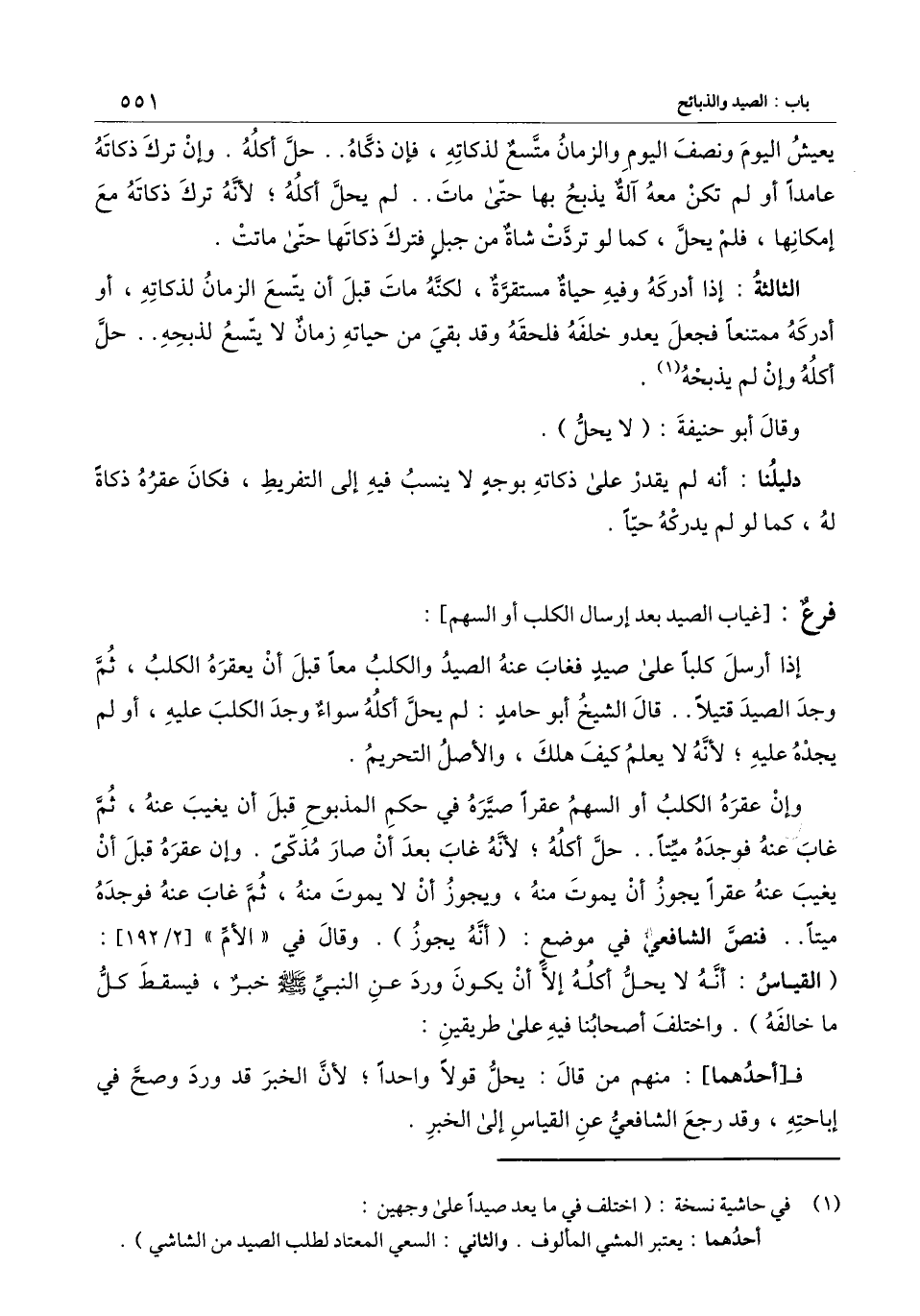 وإن عقره الكلب أو السهم عقرا صيره في حكم المذبوح قبل أن يغيب عنه ثم غاب عنه فوجده ميتا حل أكله لأنه غاب بعد أن صار مذكى وإن عقره قبل أن يغيب عنه عقرا يجوز أن يموت منه، ويجوز أن لا يموت منه ثم غاب عنه فوجده ميتا.. فنص الشافعي في موضع (أنه يجوز) وقال في (الأم) [2/192] .