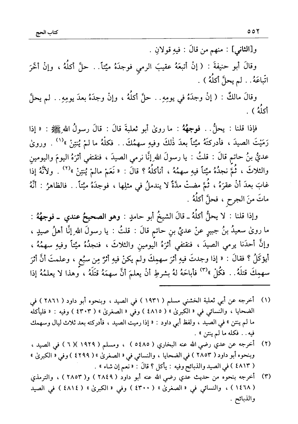 وإذا قلنا: لا يحل أكله - قال الشيخ أبو حامد: وهو الصحيح عندي ـ فوجهه: ما روى سعيد بن جبير «عن عدي بن حاتم قال: قلت: يا رسول الله إنا أهل صيد، وإن أحدنا يرمي الصيد، فنقتفي أثره اليومين والثلاث، فنجده ميتا وفيه سهمه، أيؤكل؟ فقال: " إذا وجدت فيه أثر سهمك ولم يكن فيه أثر من سبع، وعلمت أن أثر سهمك قتله.. فكل» فأباحه له بشرط أن يعلم أن سهمه قتله، وهذا لا يعلمه إذا