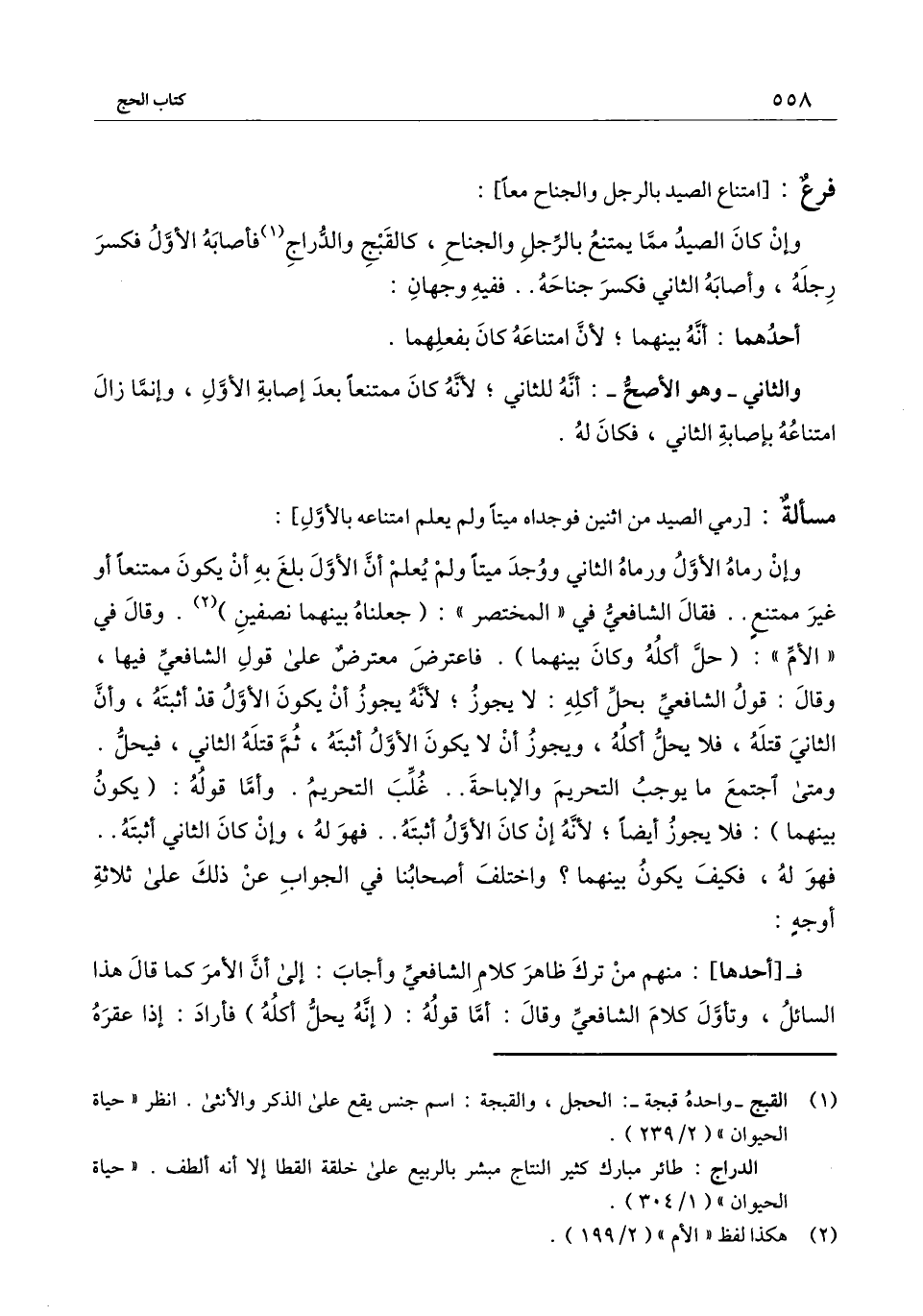 ] : وإن كان الصيد مما يمتنع بالرجل والجناح، كالقبج والدراج فأصابه الأول فكسر رجله، وأصابه الثاني فكسر جناحه.. ففيه وجهان: