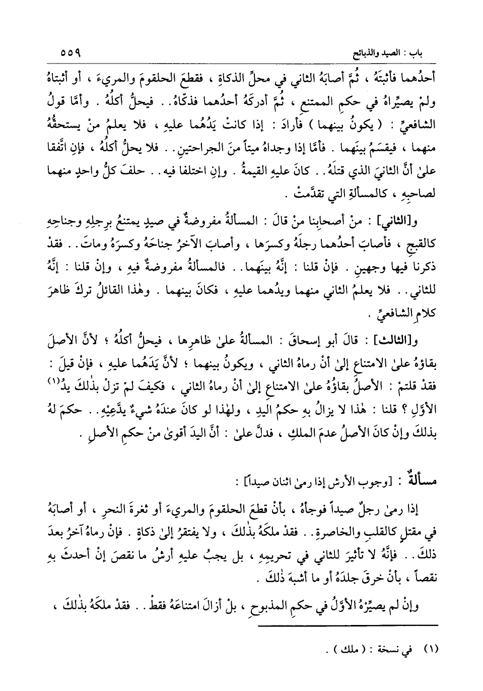 أحدهما فأثبته، ثم أصابه الثاني في محل الذكاة، فقطع الحلقوم والمريء، أو أثبتاه ولم يصيراه في حكم الممتنع، ثم أدركه أحدهما فذكاه.. فيحل أكله. وأما قول الشافعي: (يكون بينهما) فأراد: إذا كانت يدهما عليه، فلا يعلم من يستحقه منهما، فيقسم بينهما. فأما إذا وجداه ميتا من الجراحتين.. فلا يحل أكله، فإن اتفقا على أن الثاني الذي قتله.. كان عليه القيمة. وإن اختلفا فيه.. حلف كل واحد منهما لصاحبه، كالمسألة التي تقدمت.