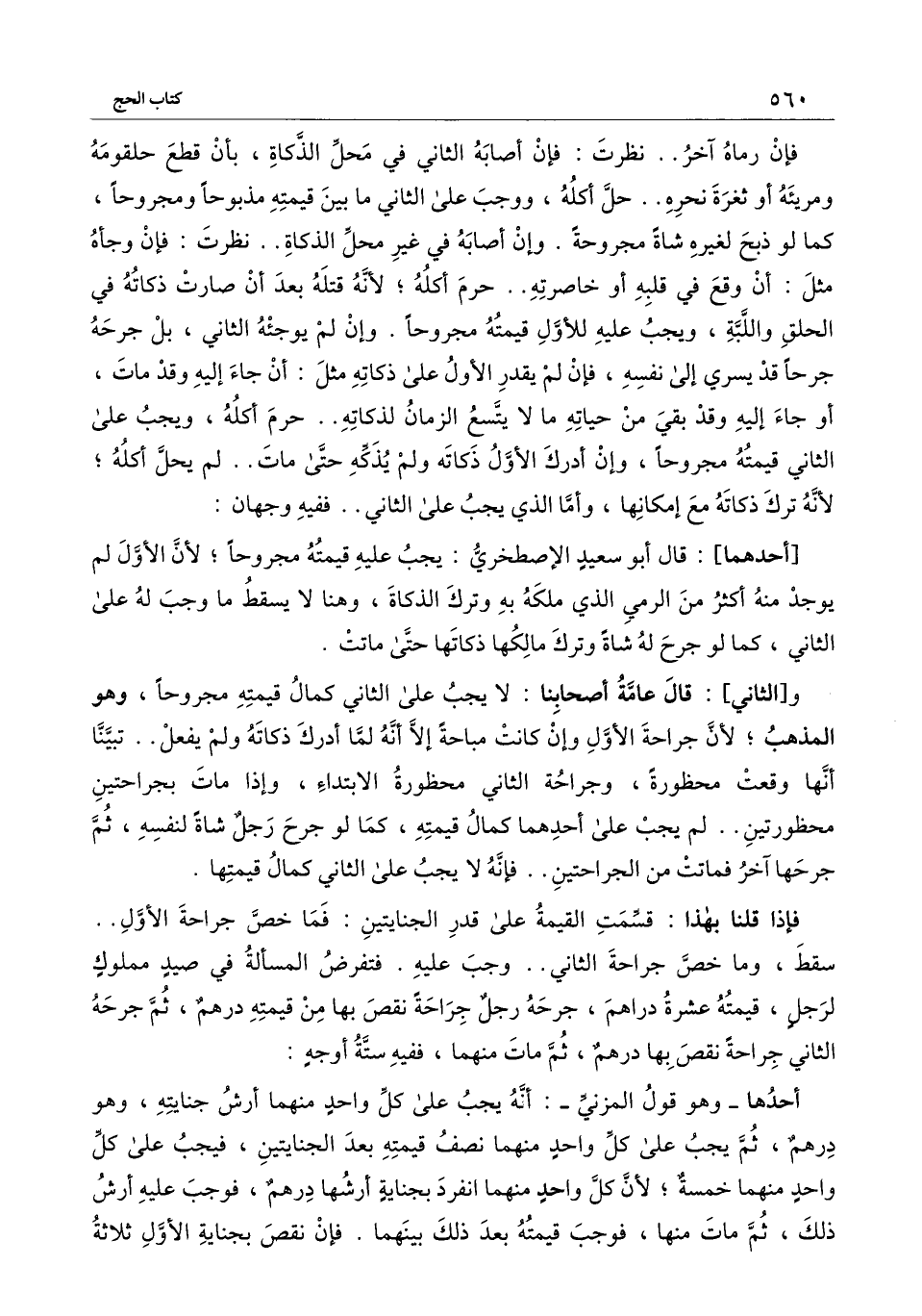 و [الثاني] : قال عامة أصحابنا: لا يجب على الثاني كمال قيمته مجروحا، وهو المذهب؛ لأن جراحة الأول وإن كانت مباحة إلا أنه لما أدرك ذكاته ولم يفعل.. تبينا أنها وقعت محظورة، وجراحة الثاني محظورة الابتداء، وإذا مات بجراحتين محظورتين.. لم يجب على أحدهما كمال قيمته، كما لو جرح رجل شاة لنفسه، ثم جرحها آخر فماتت من الجراحتين.. فإنه لا يجب على الثاني كمال قيمتها.