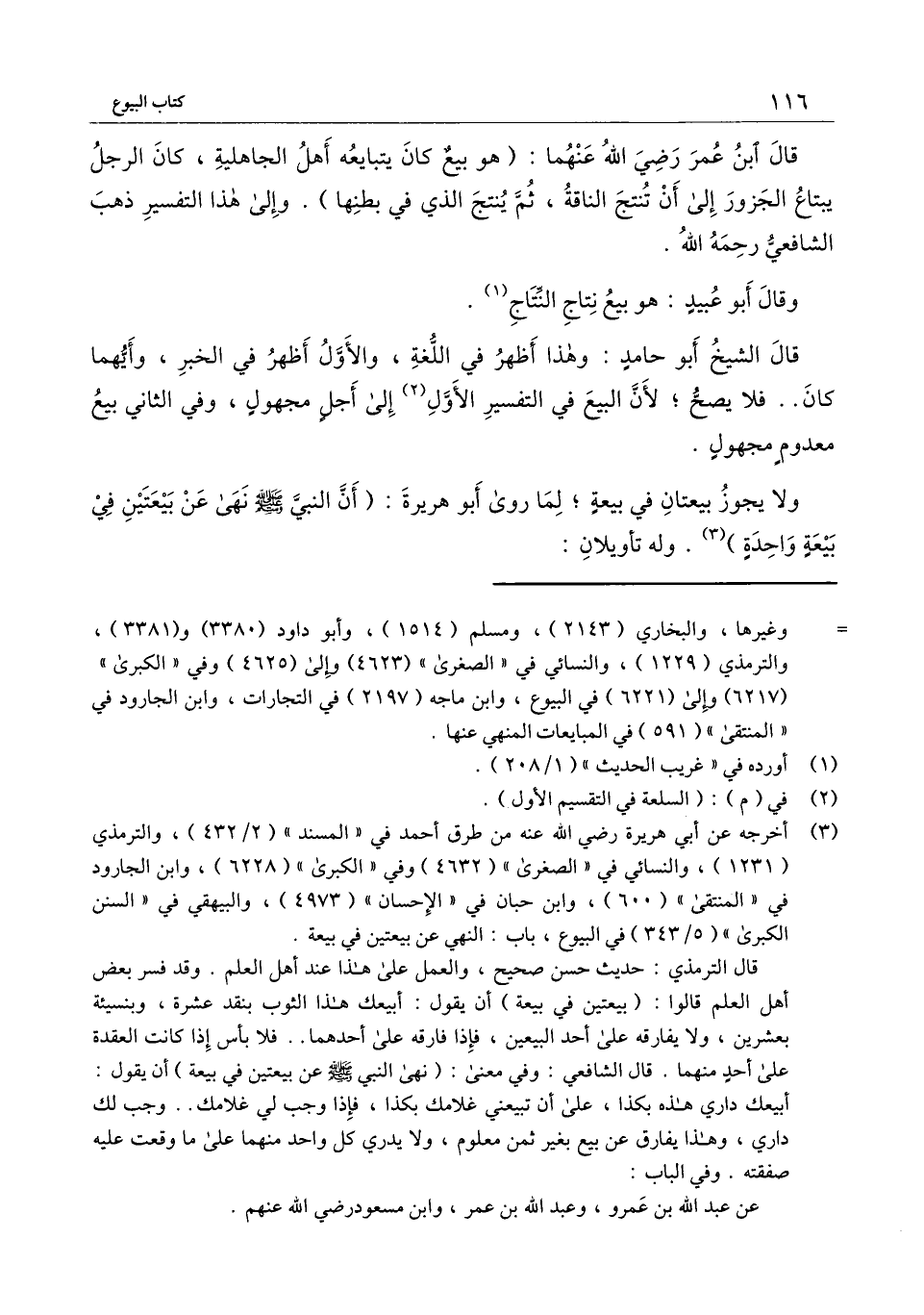 قال ابن عمر - رَضِيَ اللَّهُ عَنْهُمَا -: (هو بيع كان يتبايعه أهل الجاهلية، كان الرجل يبتاع الجزور إلى أن تنتج الناقة، ثم ينتج الذي في بطنها) . وإلى هذا التفسير ذهب الشافعي - رَحِمَهُ اللَّهُ -.