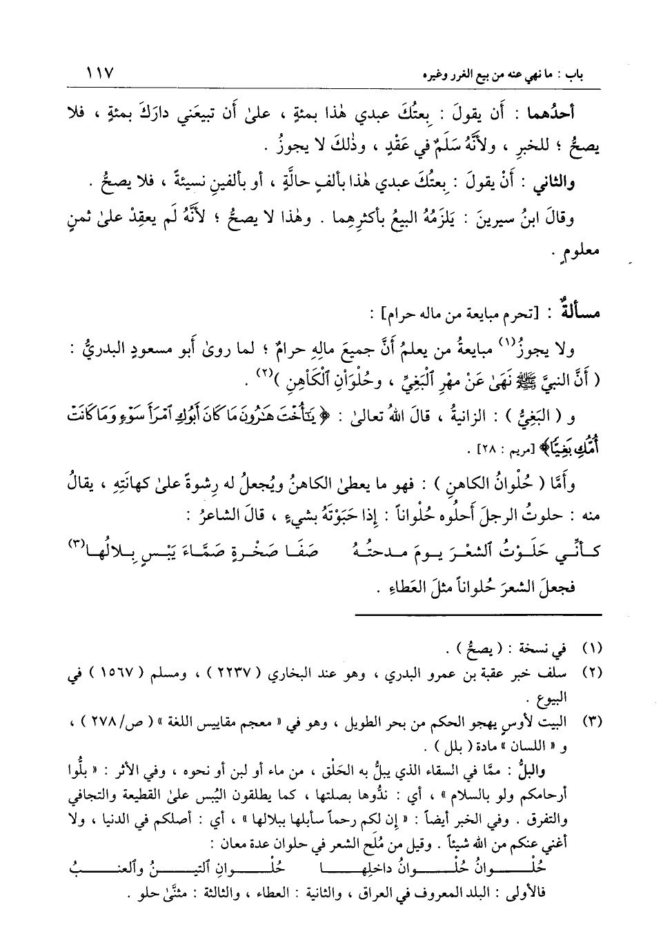 ] : ولا يجوز مبايعة من يعلم أن جميع ماله حرامٌ؛ لما روى أبو مسعود البدري: «أن النبي - صَلَّى اللَّهُ عَلَيْهِ وَسَلَّمَ - نهى عن مهر البغي، وحلوان الكاهن» .