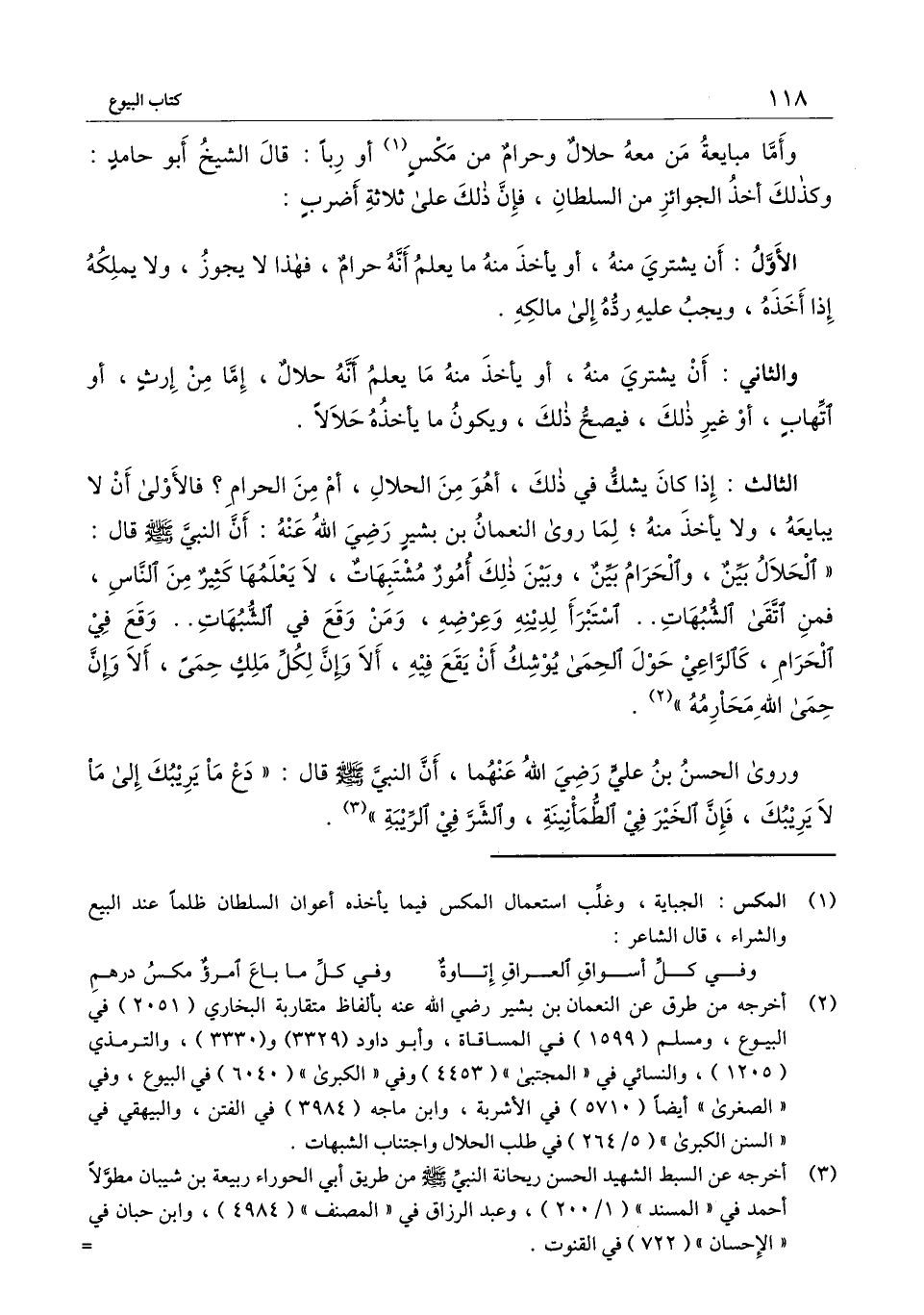 الثالث: إذا كان يشك في ذلك، أهو من الحلال، أم من الحرام؟ فالأولى أن لا يبايعه، ولا يأخذ منه؛ لما روى النعمان بن بشير - رَضِيَ اللَّهُ عَنْهُ -: أن النبي - صَلَّى اللَّهُ عَلَيْهِ وَسَلَّمَ - قال: «الحلال بين، والحرام بين، وبين ذلك أمور مشتبهات، لا يعلمها كثيرٌ من الناس، فمن اتقى الشبهات.. استبرأ لدينه وعرضه، ومن وقع في الشبهات.. وقع في الحرام، كالرَّاعي حول الحمى يوشك أن يقع فيه، ألا وإن لكل ملك حمى، ألا وإنّ حمى الله محارمه» .