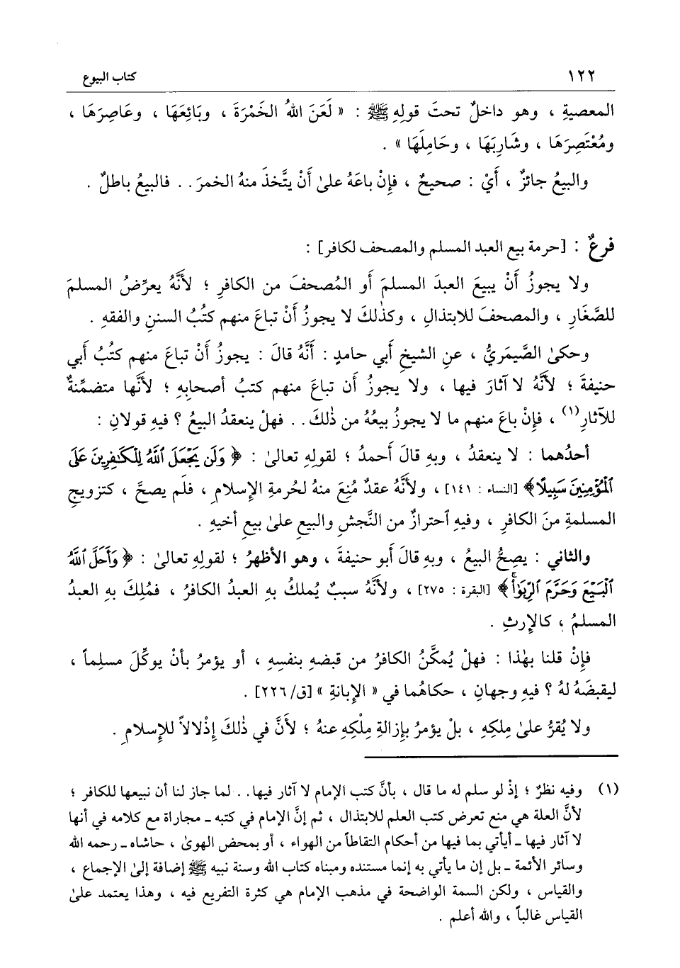ولا يجوز أن يبيع العبد المسلم أو المصحف من الكافر؛ لأنه يعرض المسلم للصغار، والمصحف للابتذال، وكذلك لا يجوز أن تباع منهم كتب السنن والفقه.