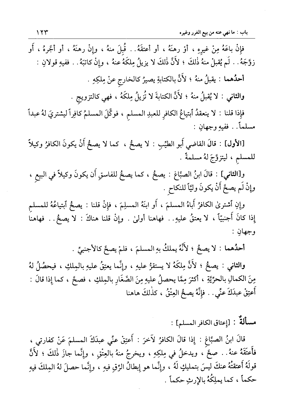 قال ابن الصباغ: إذا قال الكافر لآخر: أعتق عني عبدك المسلم عن كفارتي، فأعتقه عنه.. صح، ويدخل في ملكه، ويخرج منه بالعتق، وإنما جاز ذلك؛ لأن قوله أعتقته عنك ليس بتمليك له، وإنما هو إبطال الرق فيه، وإنّما حصل له الملك فيه حكمًا، كما يملكه بالإرث حكمًا.
