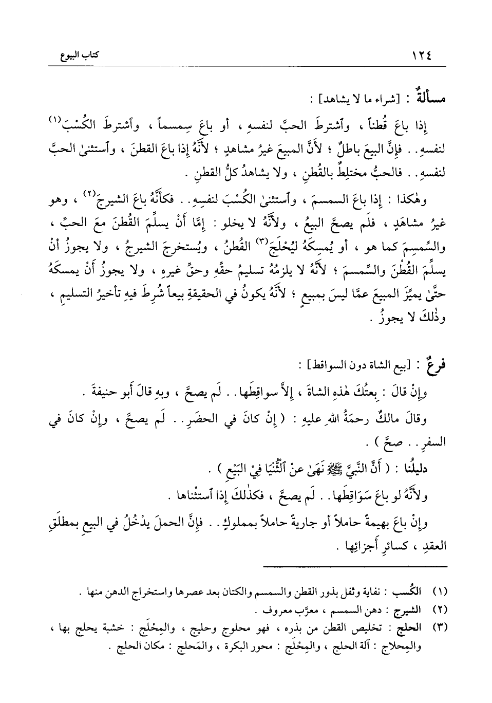 إذا باع قطنًا، واشترط الحب لنفسه، أو باع سمسمًا، واشترط الكسب لنفسه.. فإن البيع باطلٌ؛ لأن المبيع غير مشاهد؛ لأنه إذا باع القطن، واستثنى الحب لنفسه.. فالحب مختلط بالقطن، ولا يشاهد كل القطن.