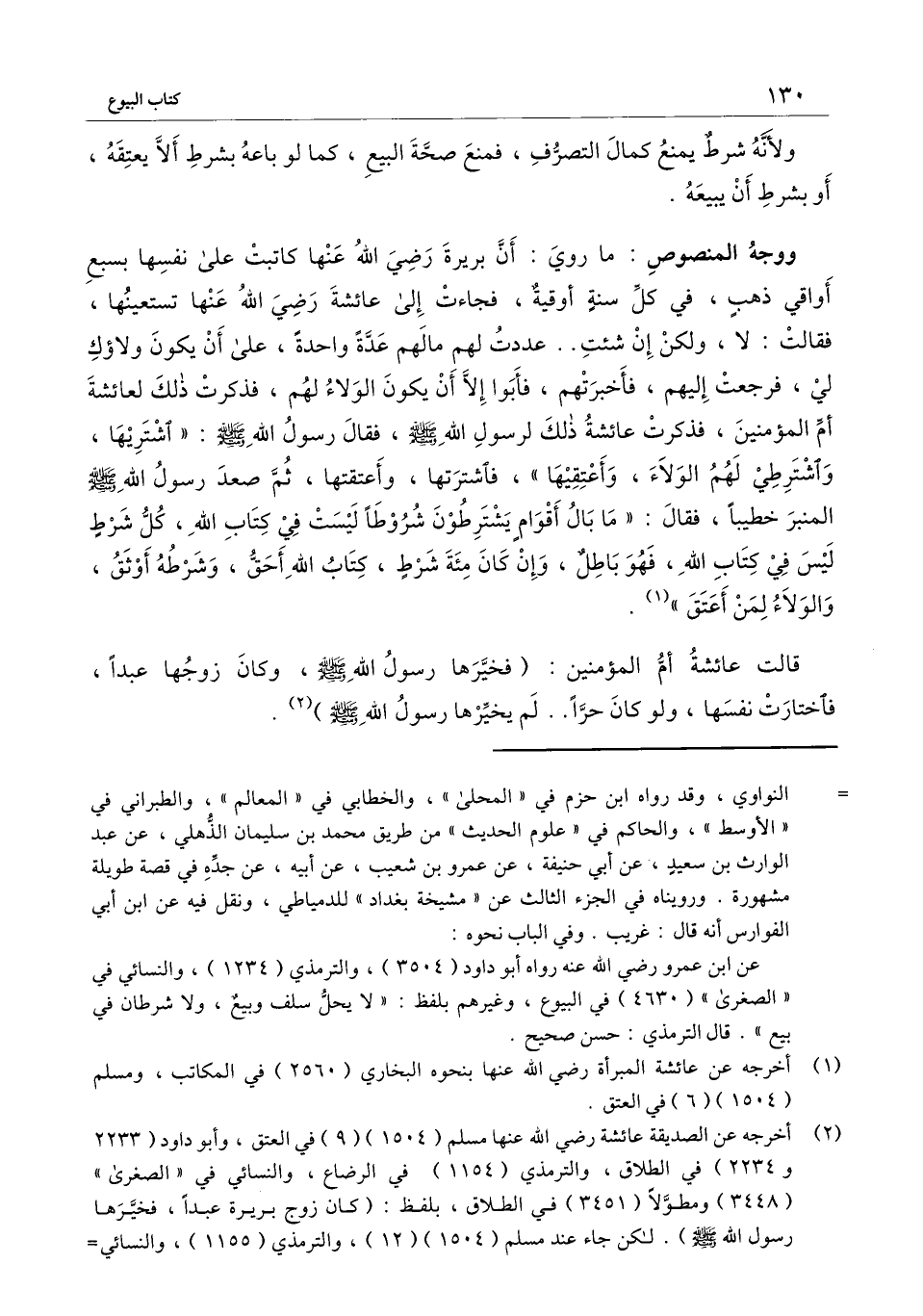 ووجه المنصوص: ما روي: «أن بريرة - رَضِيَ اللَّهُ عَنْهَا - كاتبت على نفسها بسبع أواقي ذهب، في كل سنة أوقية، فجاءت إلى عائشة - رَضِيَ اللَّهُ عَنْهَا - تستعينها، فقالت: لا، ولكن إن شئتِ.. عددت لهم مالهم عدَّةً واحدة، على أن يكون ولاؤك لي، فرجعت إليهم، فأخبرتهم، فأبوا إلا أن يكون الولاء لهم، فذكرت ذلك لعائشة أم المؤمنين، فذكرت عائشة ذلك لرسول الله - صَلَّى اللَّهُ عَلَيْهِ وَسَلَّمَ -، فقال رسول الله - صَلَّى اللَّهُ عَلَيْهِ وَسَلَّمَ -: " اشتريها، واشترطي لهم الولاء، وأعتقيها "، فاشترتها، وأعتقتها، ثم صعد رسول الله - صَلَّى اللَّهُ عَلَيْهِ وَسَلَّمَ - المنبر خطيبًا، فقال: " ما بال أقوام يشترطون شروطًا ليست في كتاب الله، كل شرط ليس في كتاب الله، فهو باطل، وإن كان مائة شرط، كتاب الله أحق، وشرطه أوثق، والولاء لمن أعتق ".