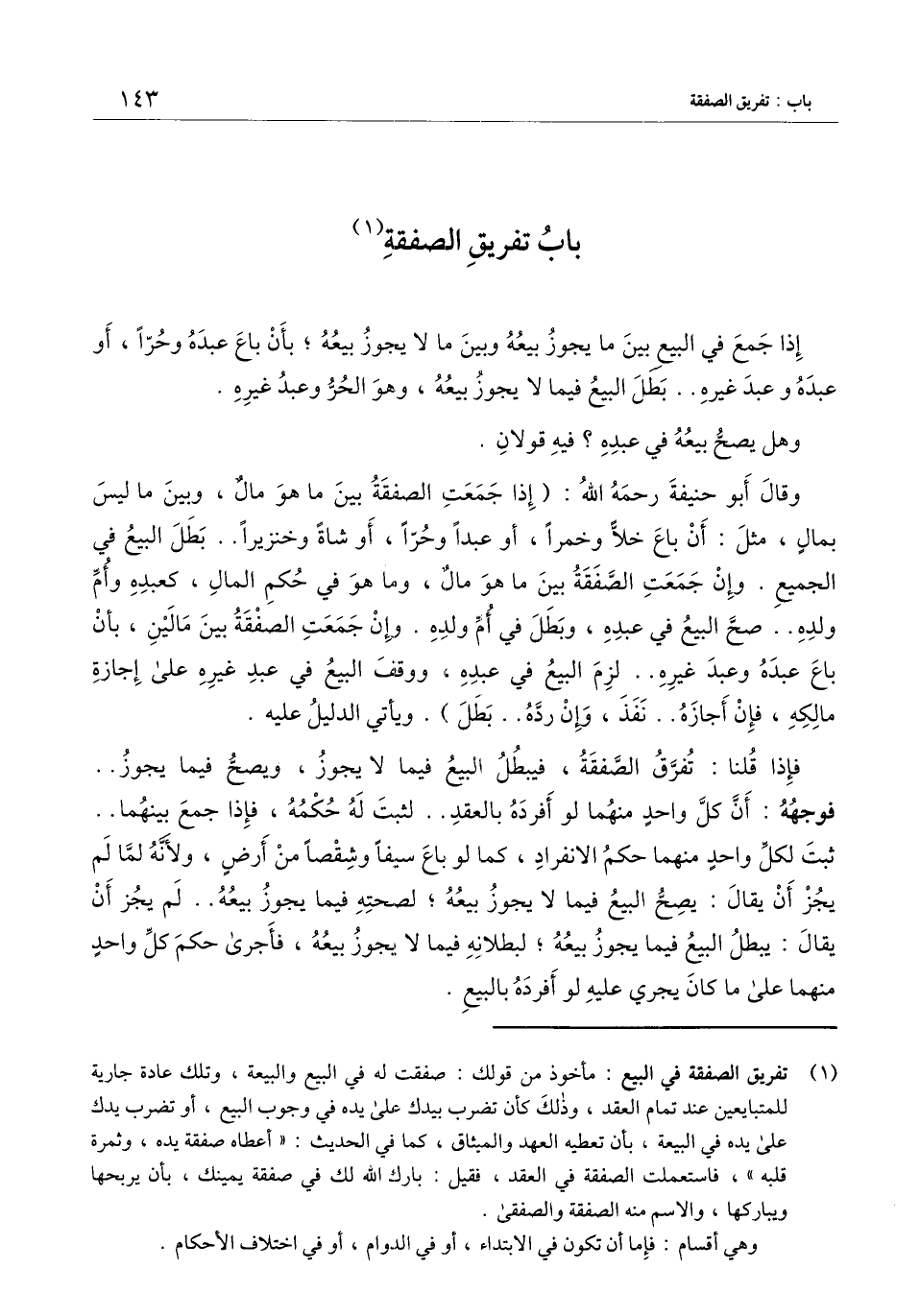 فإذا قلنا: تفرق الصفقة، فيبطل البيع فيما لا يجوز، ويصح فيما يجوز.. فوجهه: أن كل واحد منهما لو أفرده بالعقد.. لثبت له حكمه، فإذا جمع بينهما.. ثبت لكل واحد منهما حكم الانفراد، كما لو باع سيفًا وشقصًا من أرض، ولأنه لمّا لم يجُز أن يقال: يصح البيع فيما لا يجوز بيعه؛ لصحته فيما يجوز بيعه.. لم يجز أن يقال: يبطل البيع فيما يجوز بيعه؛ لبطلانه فيما لا يجوز بيعه، فأجرى حكم كل واحد منهما على ما كان يجري عليه لو أفرده بالبيع.