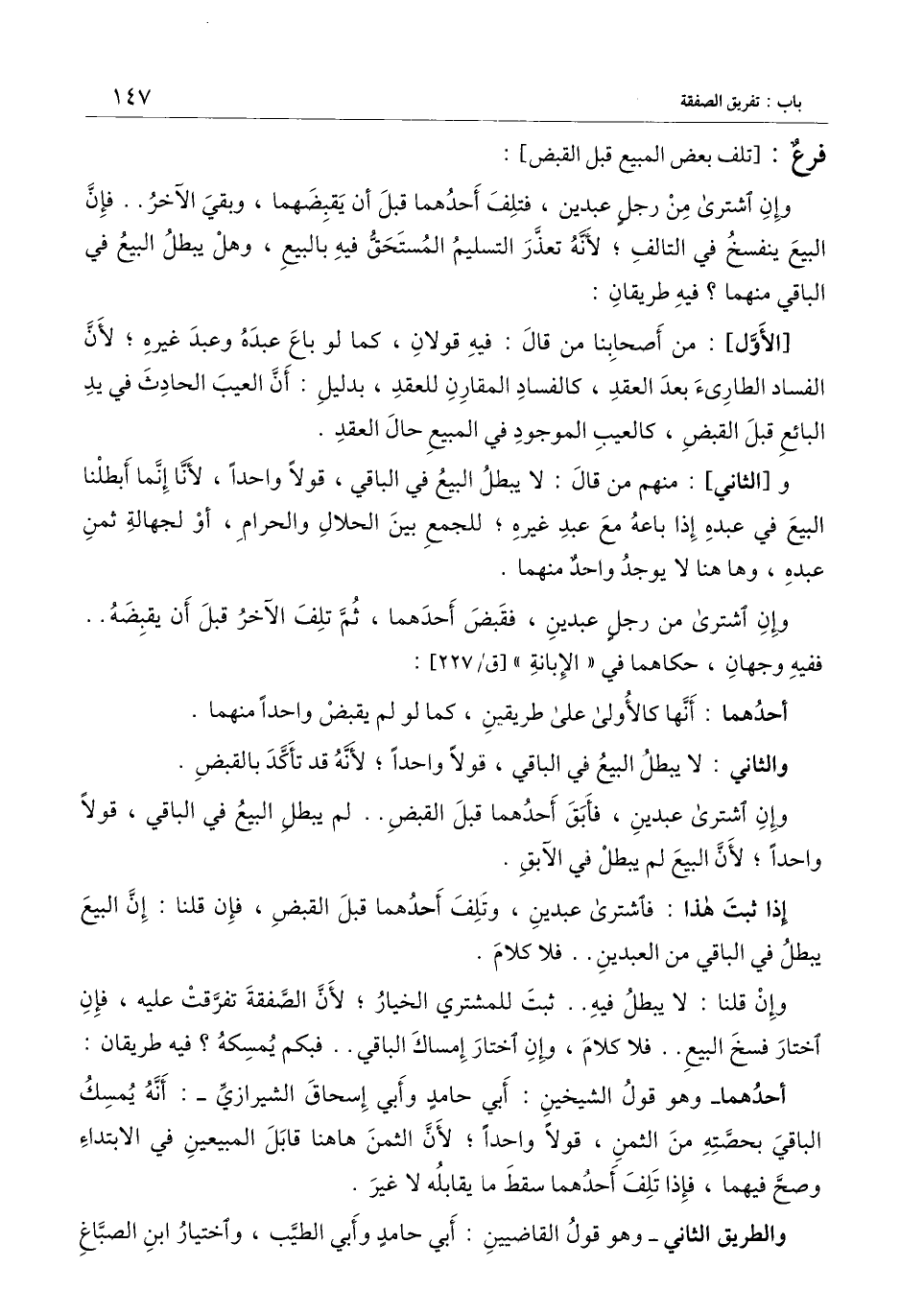 وإن اشترى من رجل عبدين، فتلف أحدهما قبل أن يقبضهما، وبقي الآخر.. فإن البيع ينفسخ في التالف؛ لأنه تعذر التسليم المستحق فيه بالبيع، وهل يبطل البيع في الباقي منهما؟ فيه طريقان: