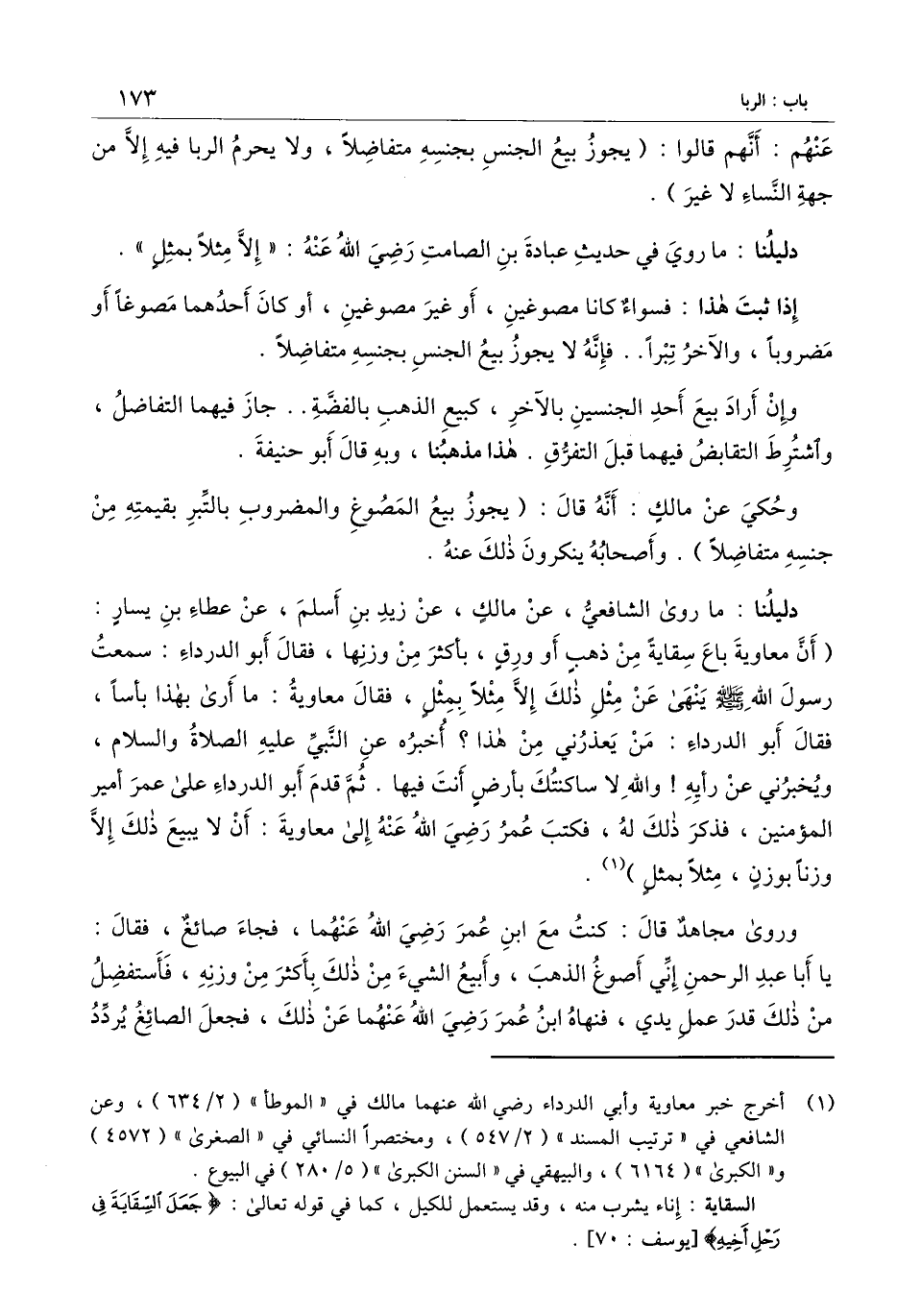 دليلنا: ما روى الشافعي، عن مالك، عن زيد بن أسلم، عن عطاء بن يسار: (أن معاوية باع سقاية من ذهب أو ورق، بأكثر من وزنها، فقال أبو الدرداء: سمعت رسول الله - صَلَّى اللَّهُ عَلَيْهِ وَسَلَّمَ - ينهى عن مثل ذلك إلاَّ مثلاً بمثل، فقال معاوية: ما أرى بهذا بأسًا، فقال أبو الدرداء: من يعذرني من هذا؟ أخبره عن النبي - عَلَيْهِ الصَّلَاةُ وَالسَّلَامُ -، ويخبرني عن رأيه! والله لا ساكنتك بأرض أنت فيها. ثم قدم أبو الدرداء على عمر أمير المؤمنين، فذكر ذلك له، فكتب عمر - رَضِيَ اللَّهُ عَنْهُ - إلى معاوية: أن لا يبيع ذلك إلا وزنًا بوزن، مثلاً بمثل) .