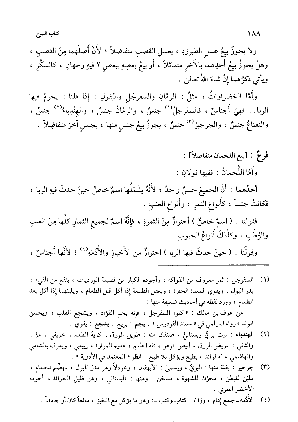 وأما الخضراوات، مثل: الرمان والسفرجل والبقول: إذا قلنا: يحرم فيها الربا.. فهي أجناسٌ، فالسفرجل جنس، والرمان جنس، والهندباء جنس، والنعناع جنس، والجرير جنس، يجوز بيع جنس منها، بجنس آخر متفاضلاً.