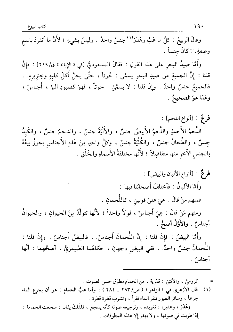 اللحم الأحمر واللحم الأبيض جنس، والألية جنس، والشحم جنس، والكبد جنس، والطحال جنس، والكلية جنس، وكل واحد من هذه الأجناس يجوز بيعه بالجنس الآخر منها متفاضلاً؛ لأنها مختلفة الأسماء والخلق.