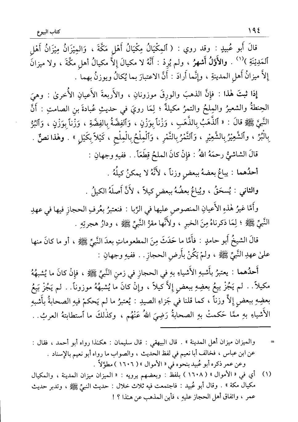 قال أبو عبيد: وقد روي: «المكيال مكيال أهل مكة، والميزان ميزان أهل المدينة» . والأول أشهر، ولم يرد: أنه لا مكيال إلا مكيال أهل مكة، ولا ميزان إلا ميزان أهل المدينة، وإنما أراد: أن الاعتبار بما يكال ويوزن بهما.
