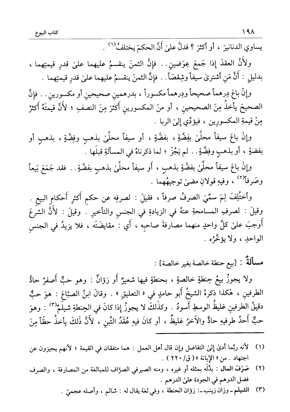 وإن باع درهمًا صحيحًا ودرهمًا مكسورًا، بدرهمين صحيحين أو مكسورين.. فإن الصحيح يأخذ من الصحيحين، أو من المكسورين أكثر من النصف؛ لأن قيمته أكثر من قيمة المكسورين، فيؤدي إلى الربا.