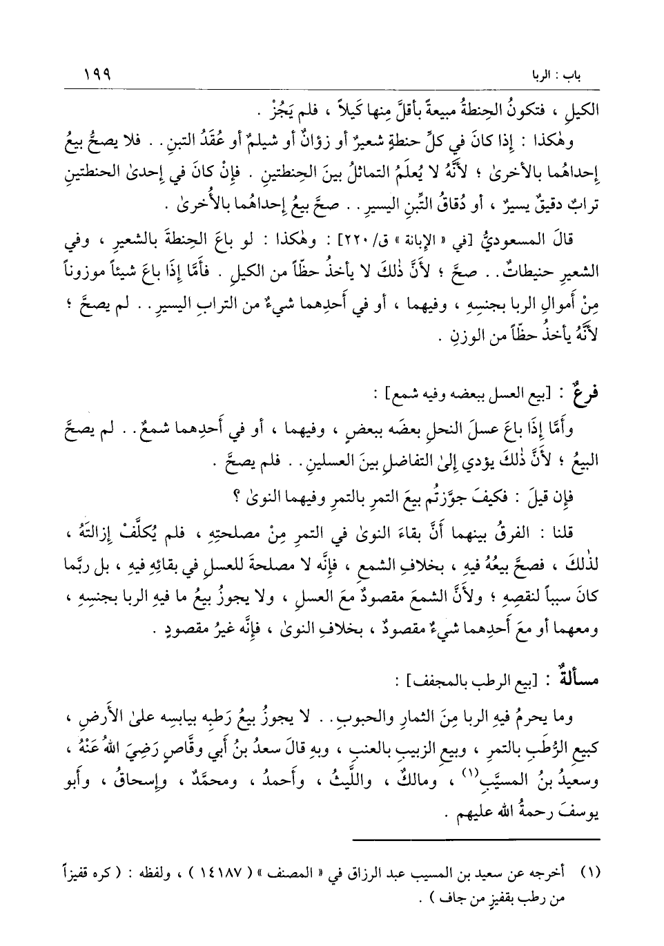 وما يحرم فيه الربا من الثمار والحبوب.. لا يجوز بيع رطبه بيابسه على الأرض، كبيع الرطب بالتمر، وبيع الزبيب بالعنب، وبه قال سعد بن أبي وقاص - رَضِيَ اللَّهُ عَنْهُ -، وسعيد بن المسيب، ومالك، والليث، وأحمد، ومحمد، وإسحاق، وأبو يوسف رحمة الله عليهم.
